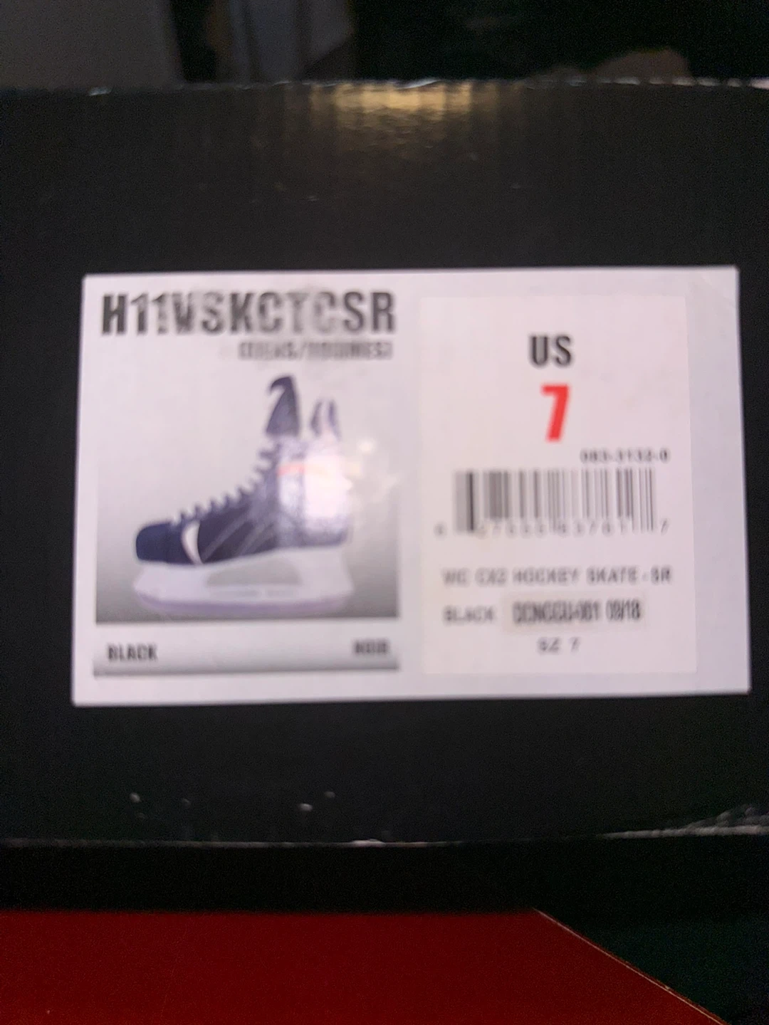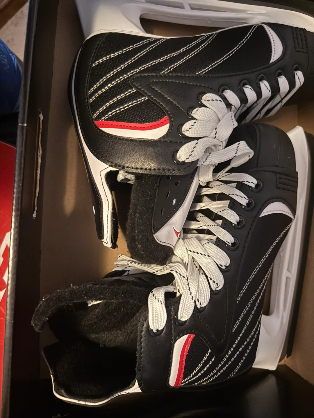 Black youth hockey skates in a US size 7. Features a synthetic leather upper and a brushed nylon liner for comfort. Includes original box.