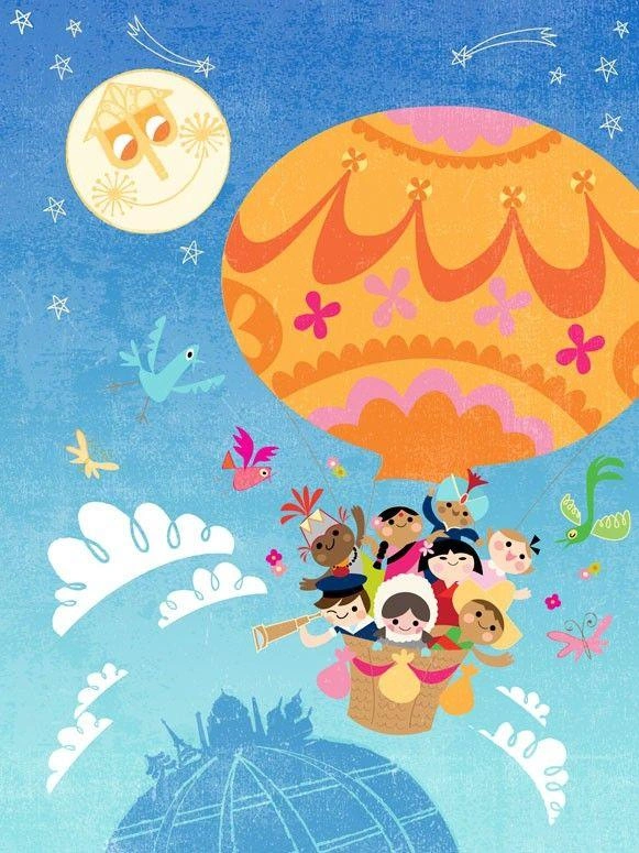 Beautiful Disney Canvas Artwork in the theme of "It's a Small World - Balloon Explorers". Bright colours, whimsical design. Perfect for a child's room or play area.