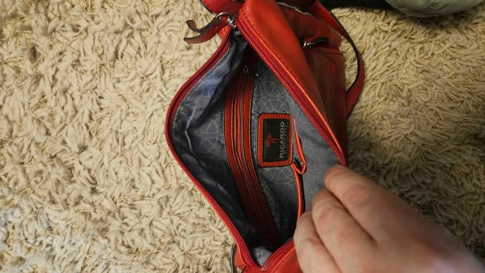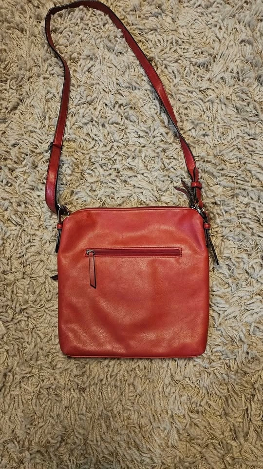 Vibrant red crossbody bag by Ricardo Beverly Hills. Has multiple zipper compartments and an adjustable strap. Super handy for everyday use!