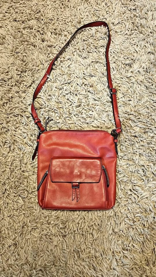 Vibrant red crossbody bag by Ricardo Beverly Hills. Has multiple zipper compartments and an adjustable strap. Super handy for everyday use!