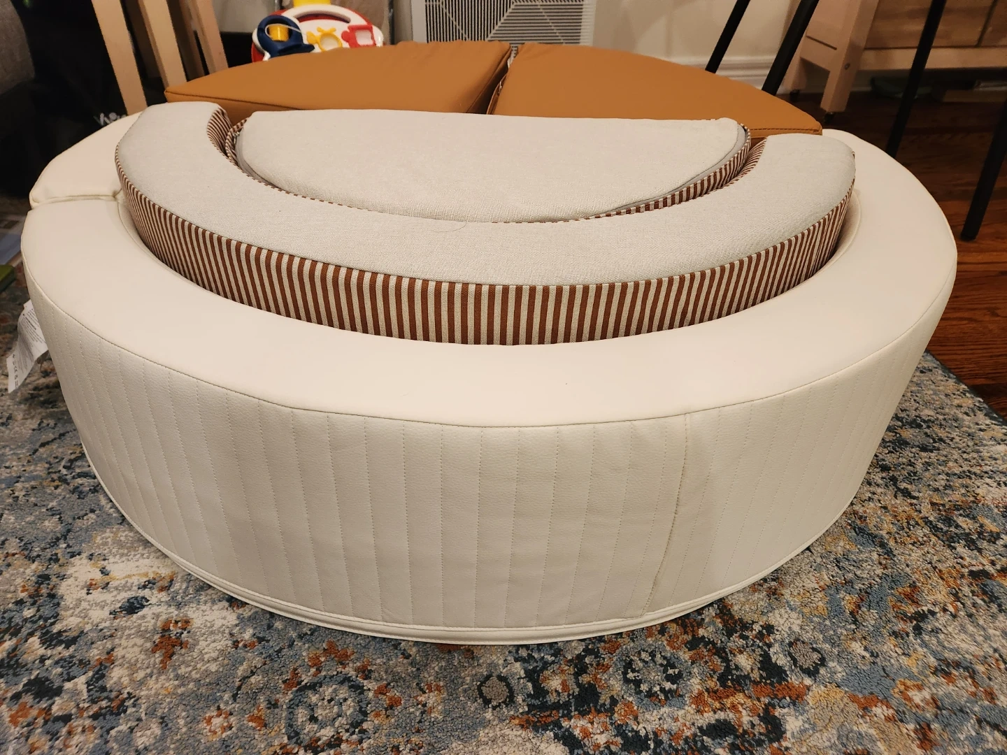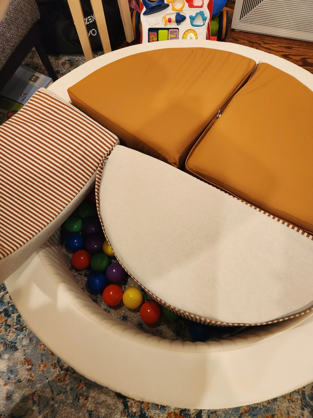 We purchased it last week, didn't realize this would be too big for our space unfortunately selling it. Baby has so far only used it for 2 days. It’s in brand new condition. No rips or stains. One of the triangle small blocks the zip doesn't close all the way through as shown in the picture. Balls are not included.