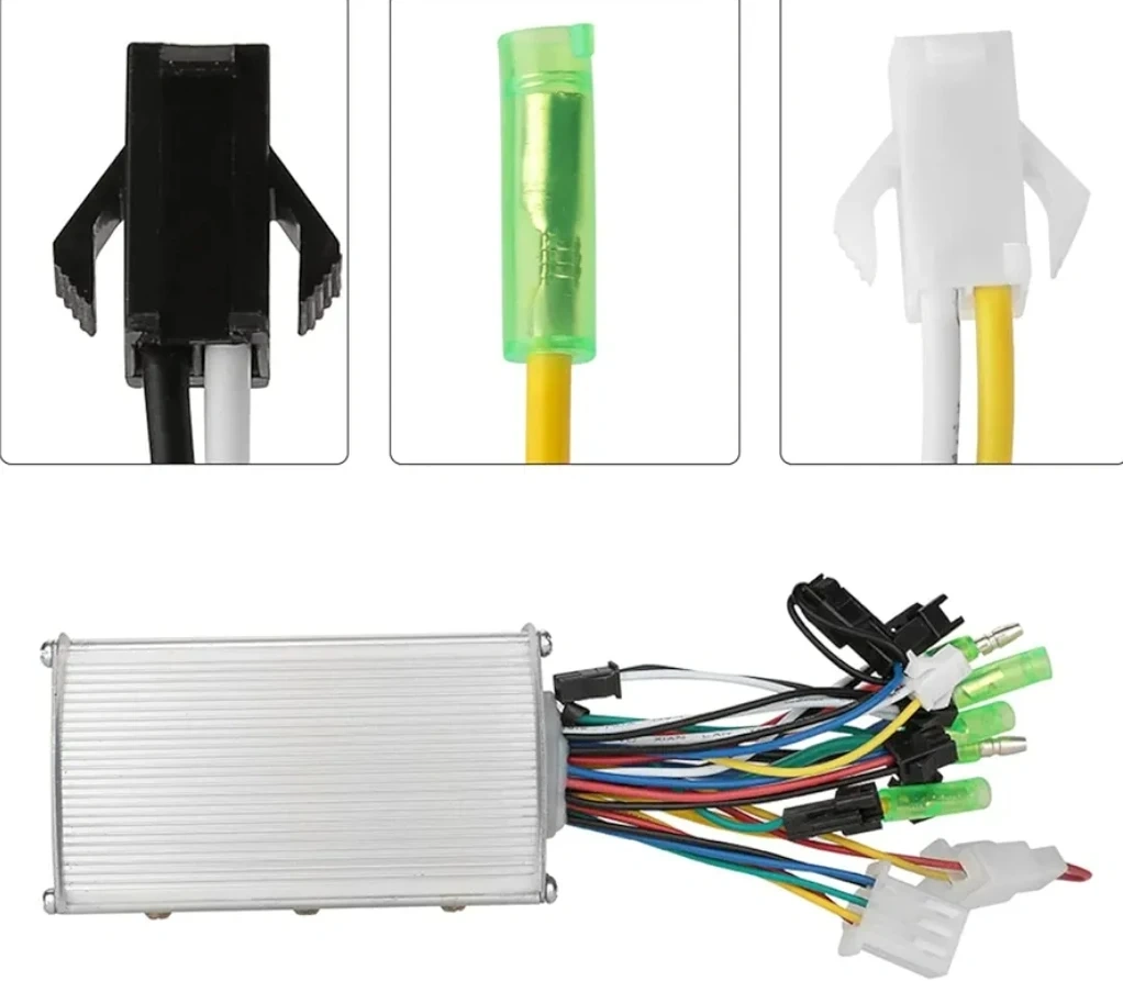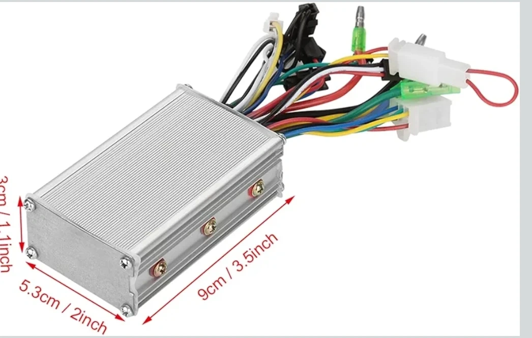 This is a brushless motor controller designed for 36/48V systems with a 350W power rating. It features an aluminum alloy shell for good heat dissipation. Dimensions are 9cm x 5.3cm x 3cm.
