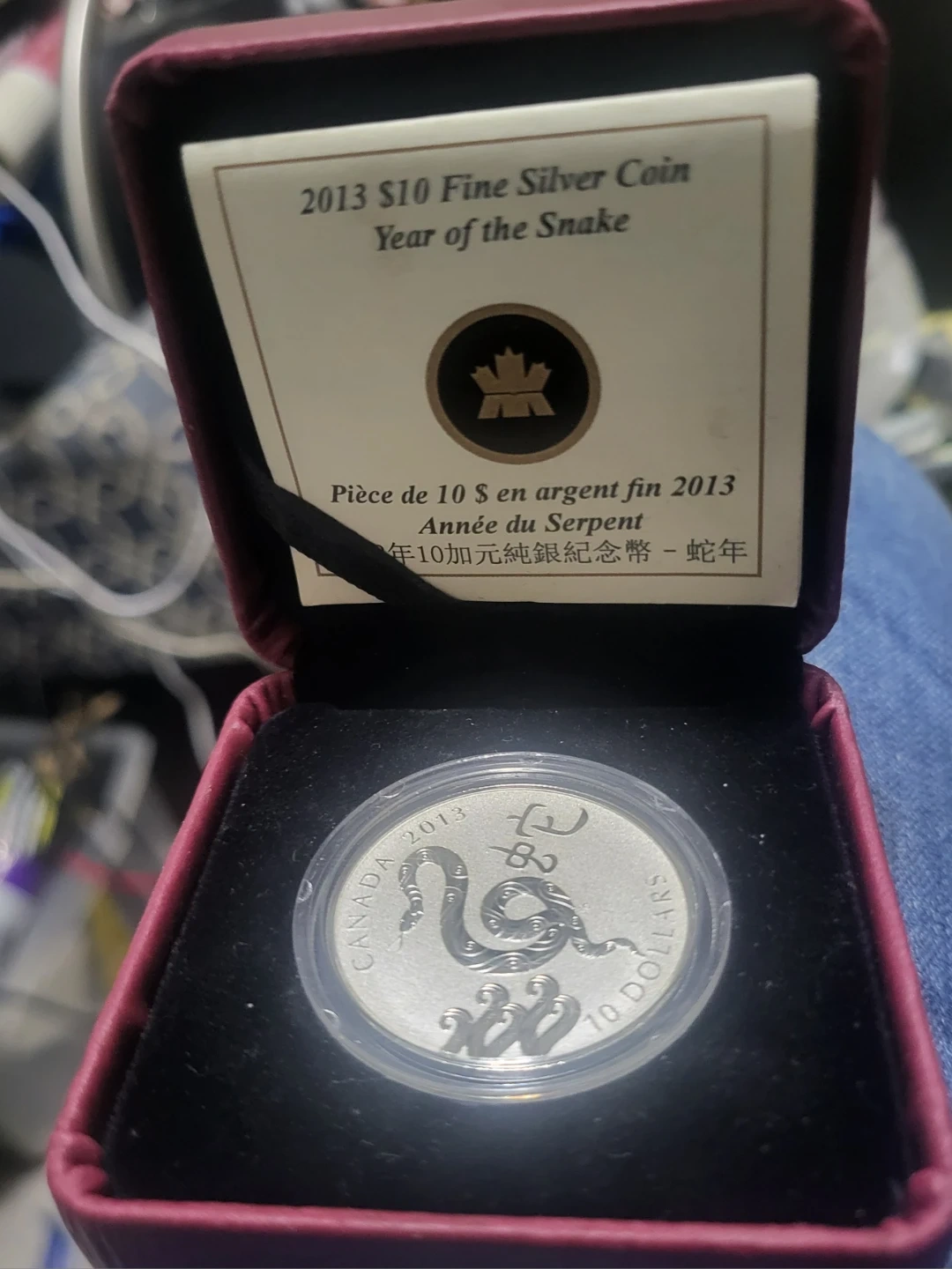 This is a 2013 $10 fine silver coin from Canada, featuring the Year of the Snake design. It's presented in a protective case with accompanying documentation. The coin is made of fine silver and has a face value of $10.