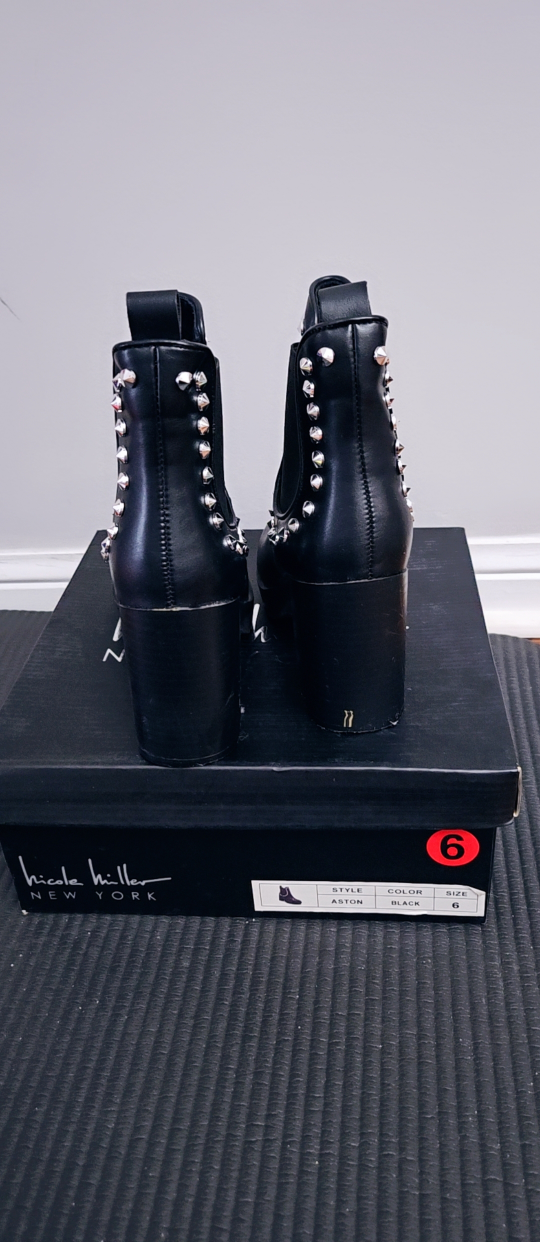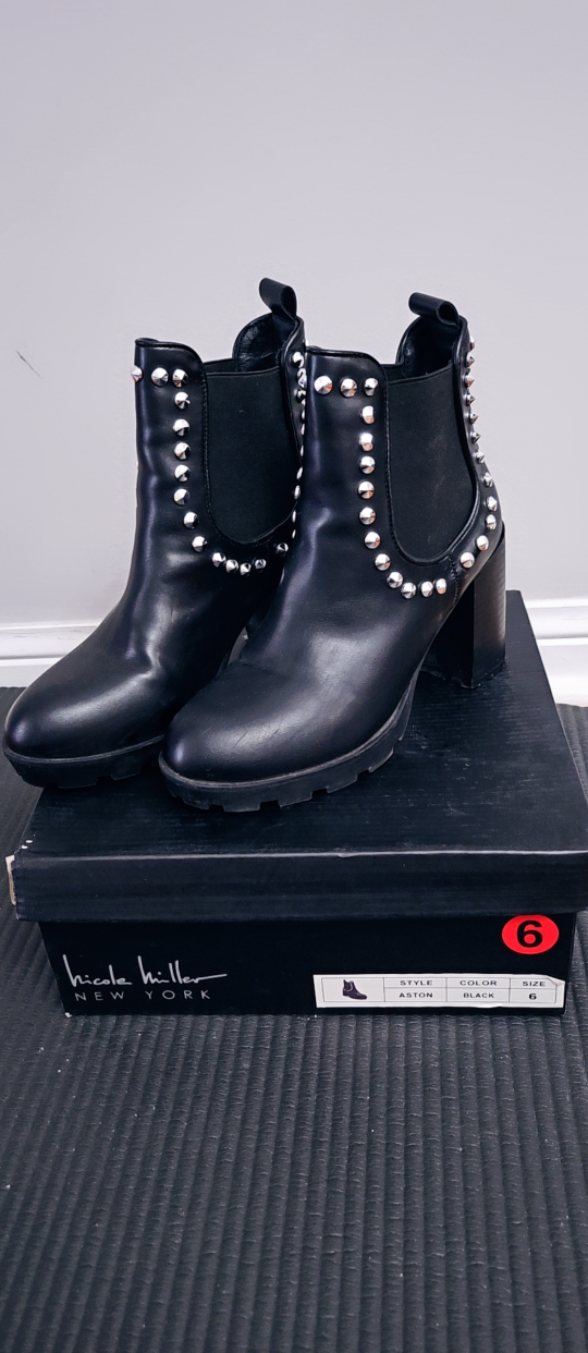 🖤💫Selling a pair of Nicole Miller New York ankle boots in black. They're a size 6 and come with the original box. These stylish boots feature studded detailing and a chunky heel, perfect for adding a bit of edge to your look!