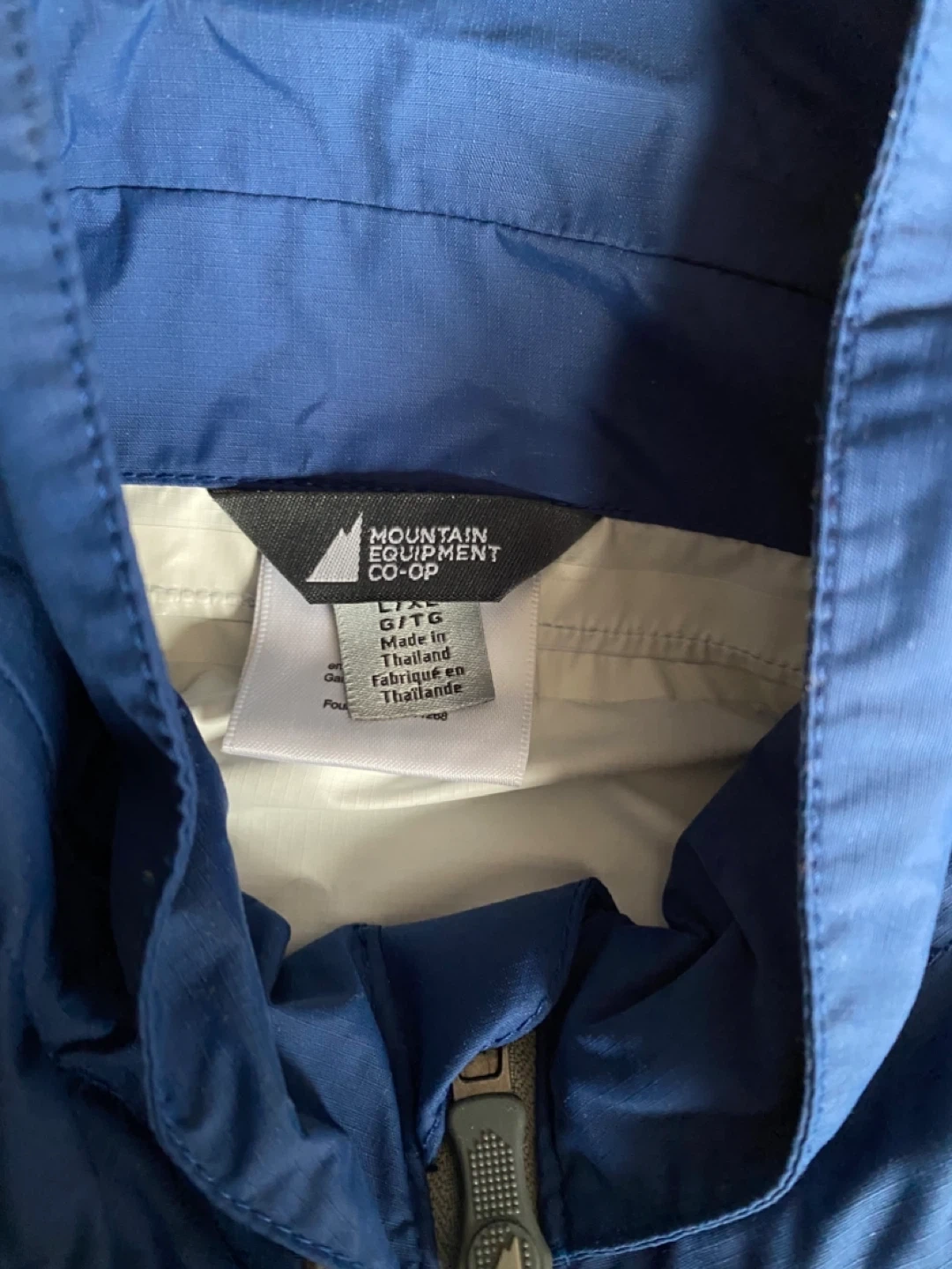 A blue rain poncho from Mountain Equipment Co-op. Size is XL. Lightweight and packable for on-the-go protection from the rain! Almost new!