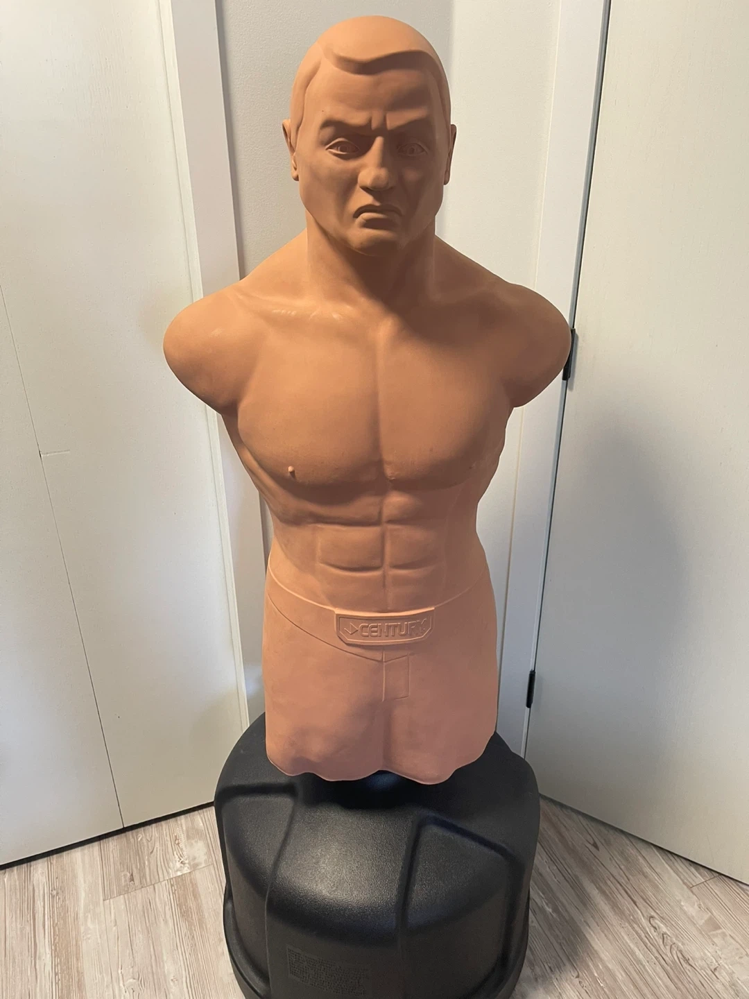 This is a Century Bob punching bag. It's designed for martial arts training and boxing practice. The torso is made of durable material, and the base can be filled with sand or water for stability.