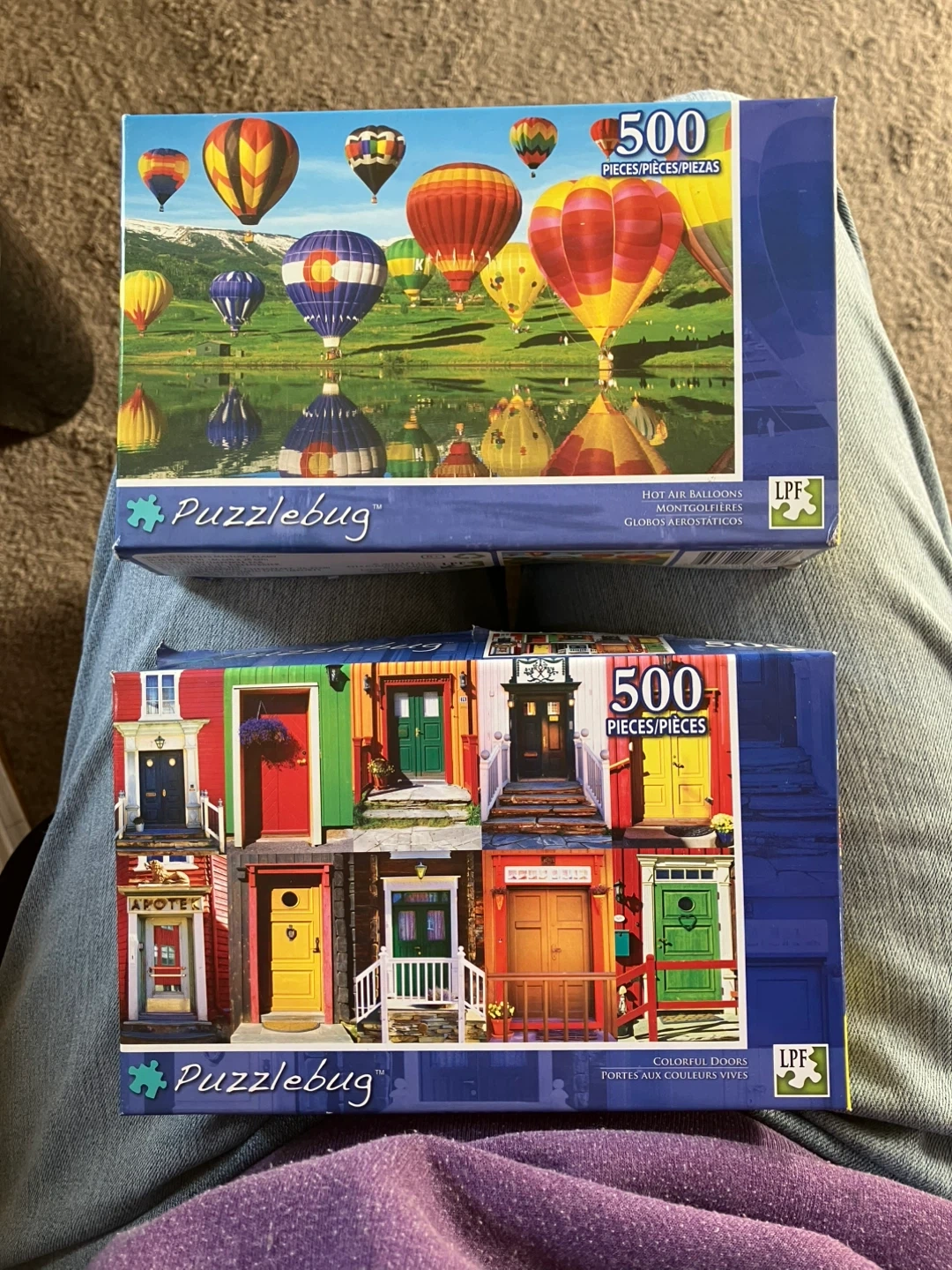Selling two Puzzlebug 500-piece puzzles! One is a hot air balloon scene and the other features colorful doors. Both are complete and ready for a new puzzler