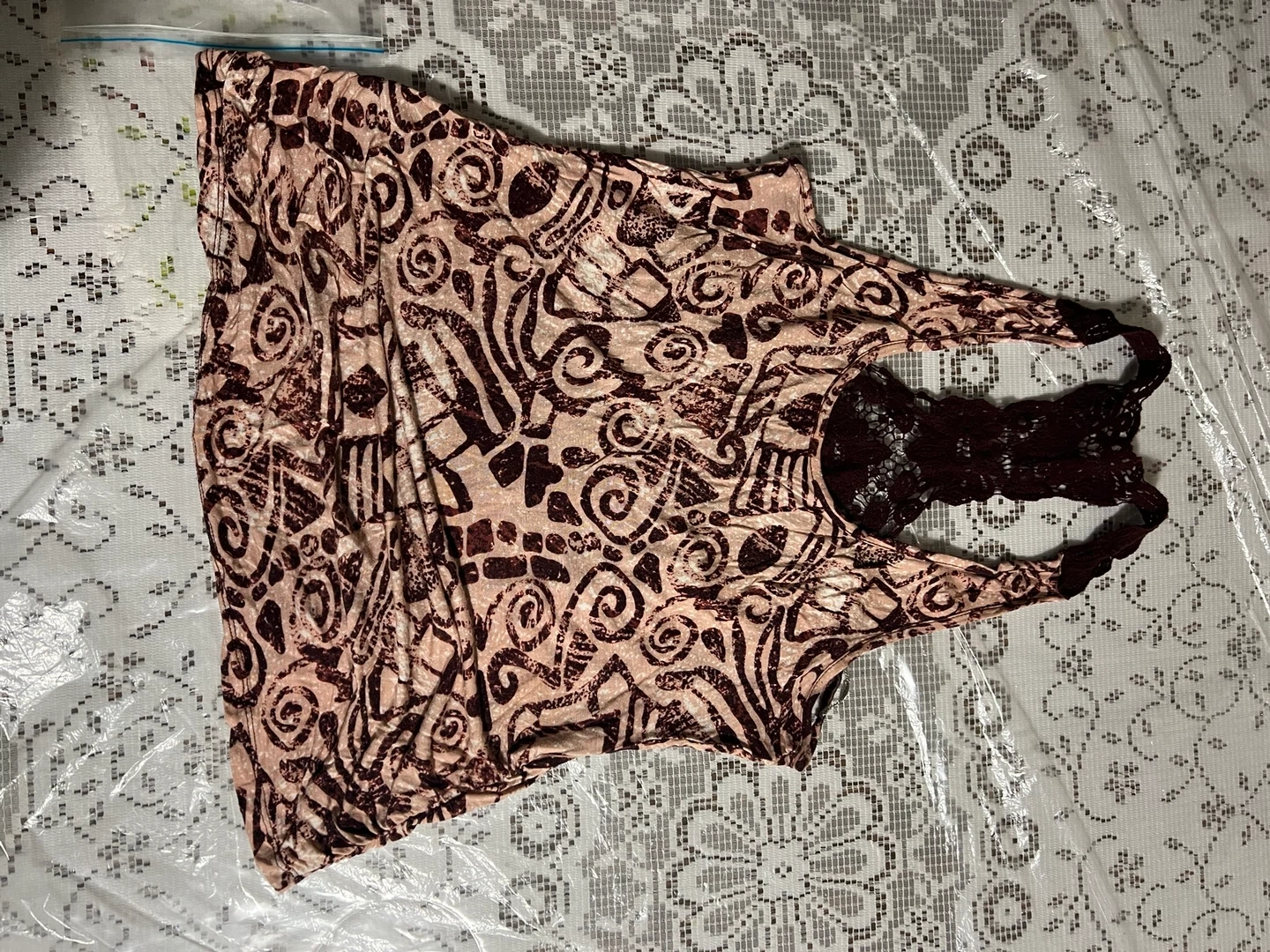 Selling a cute tank top in a mix of brown and pink tones! It features a unique pattern and a lace detail on the front.