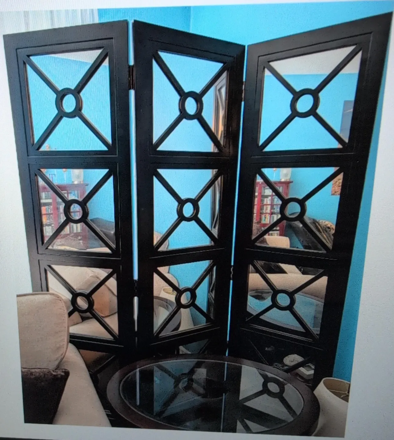 This is a lovely black 3paneled folding privacy screen room divider. It's perfect for adding a touch of elegance and privacy to any room. The screen features a unique design with circular and geometric patterns. It's in great condition and ready to enhance your living space!