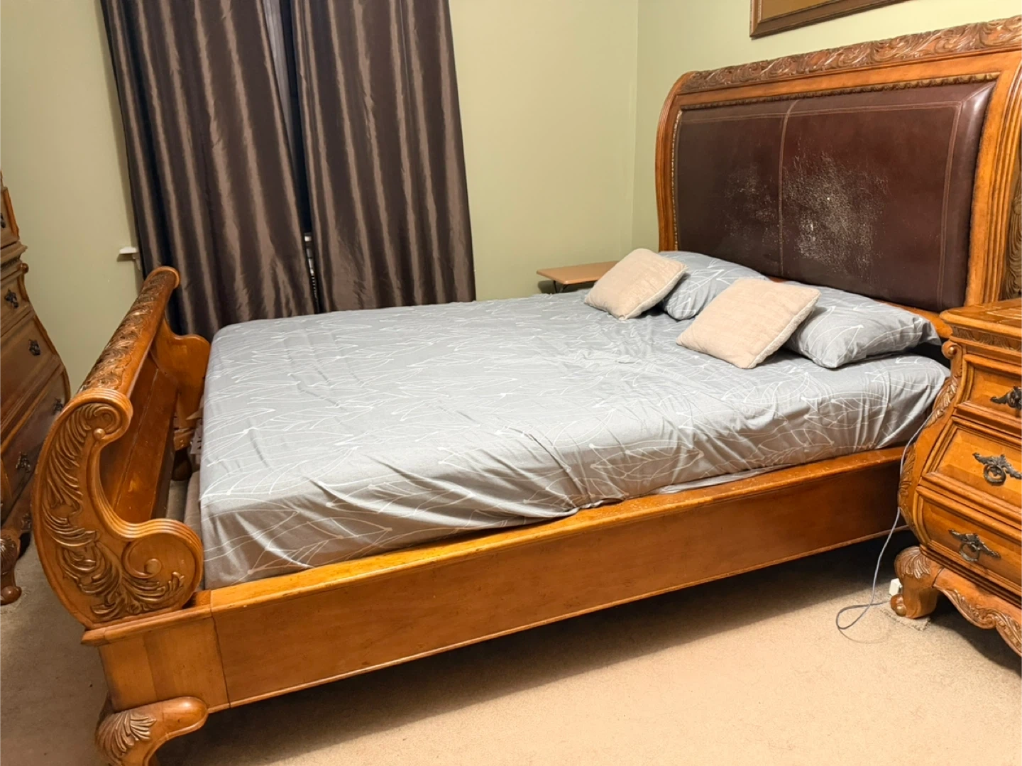 King size bed frame featuring ornate wood carvings and a leather headboard. The bed frame shows some signs of wear on the headboard, but is otherwise in good condition. It has a classic and elegant design. It doesn’t come with Mattress.