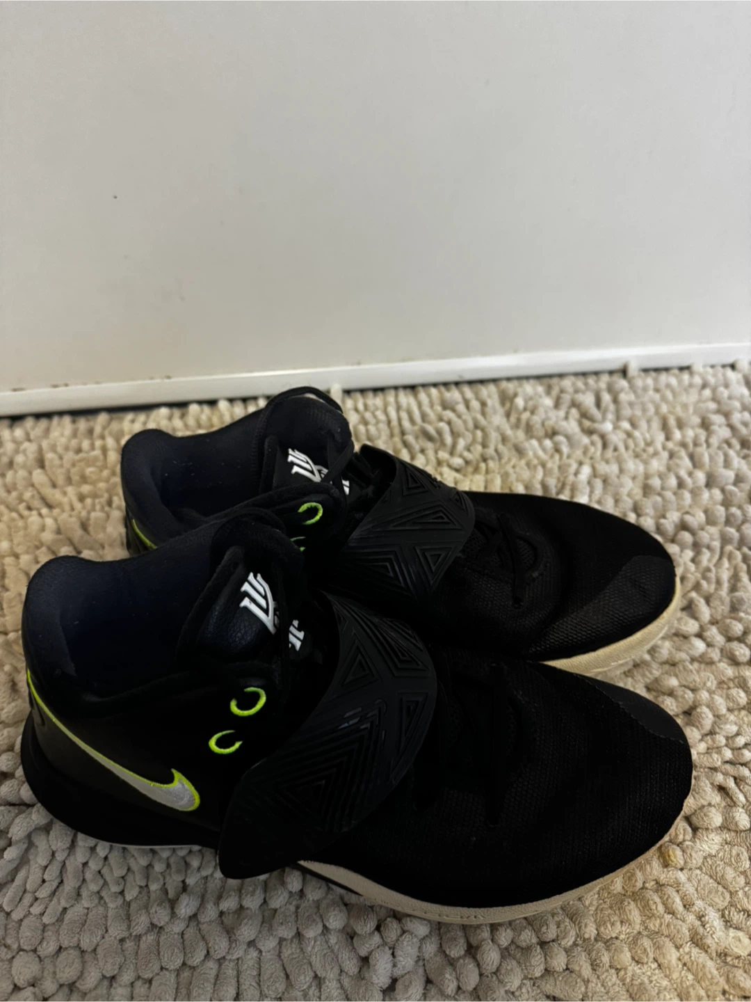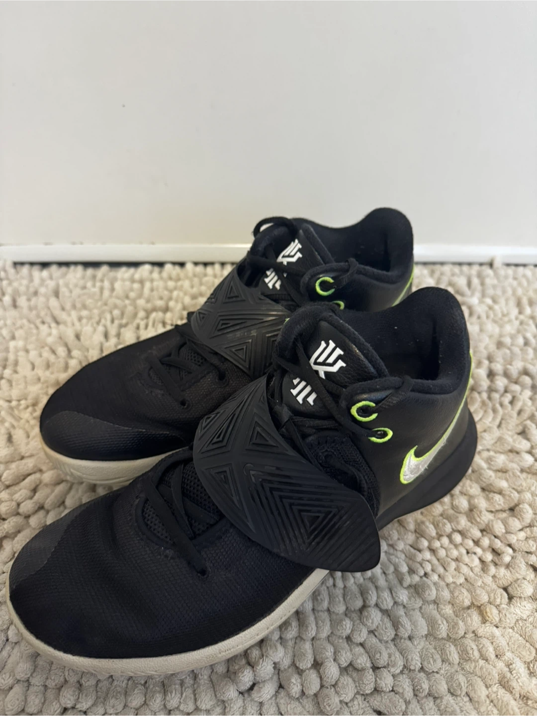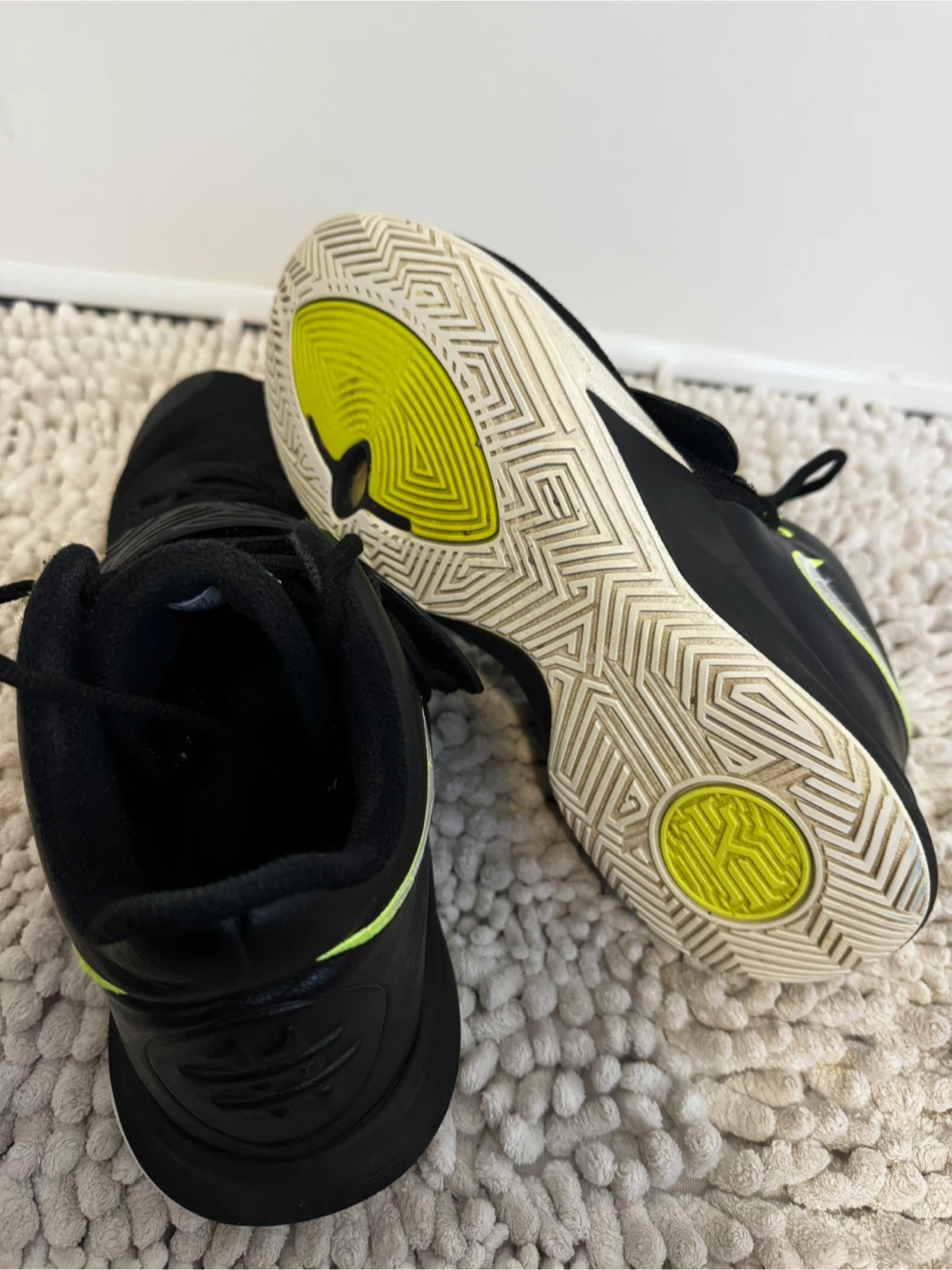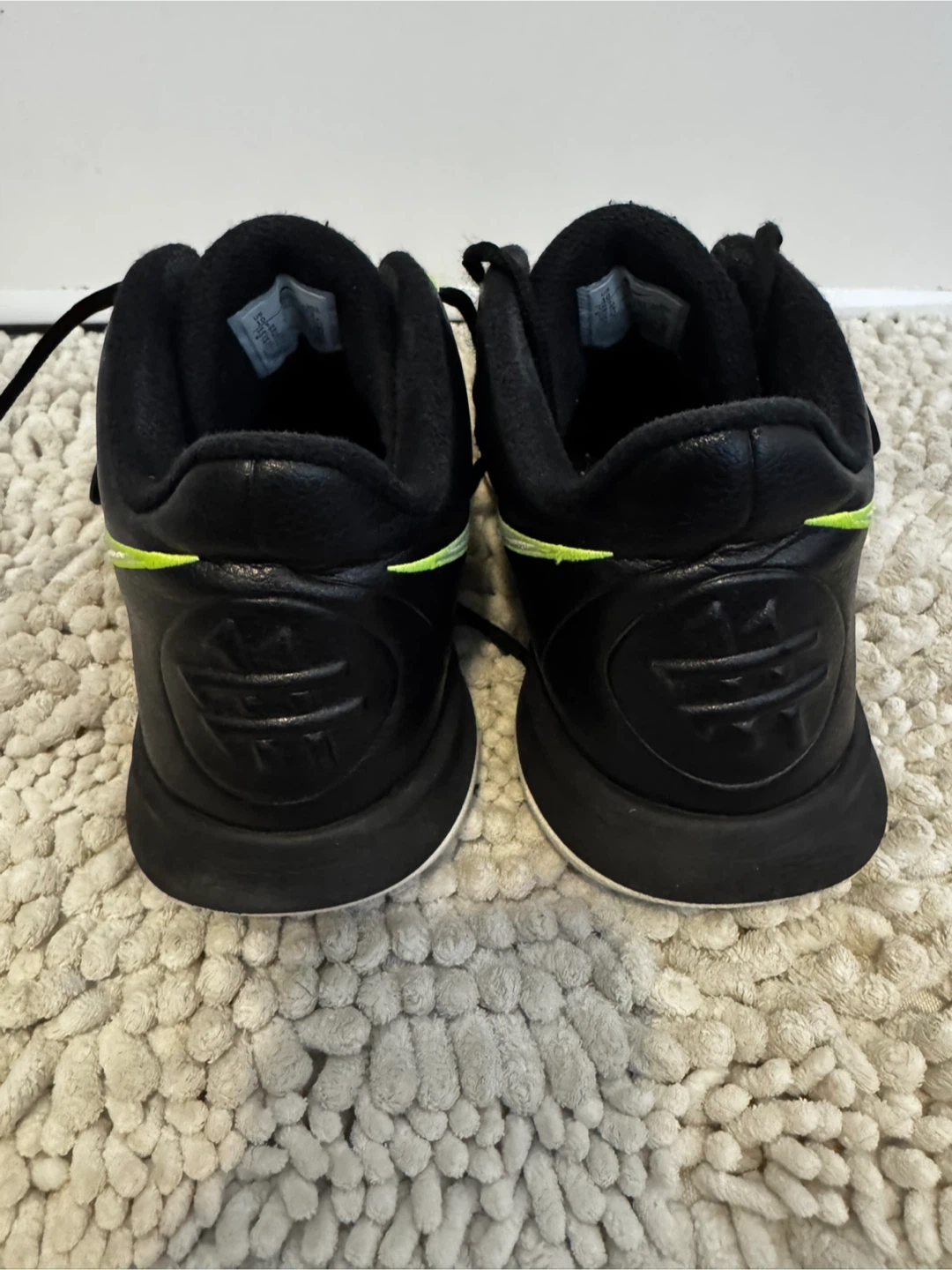 Nike Kyrie III basketball shoes in size 10, featuring a sleek black design with vibrant green accents. Ideal for athletes looking for reliable performance and stylish footwear on the court.