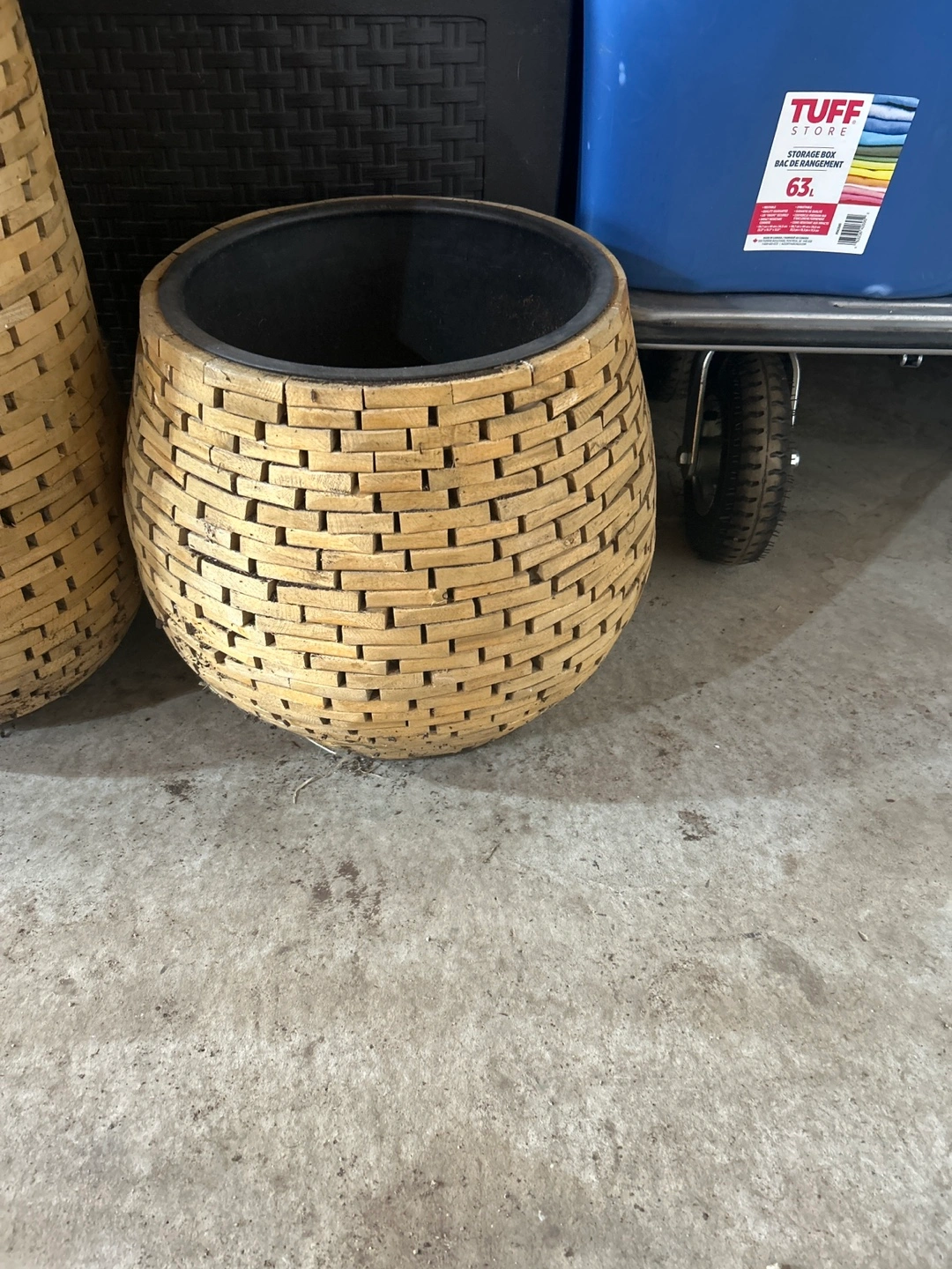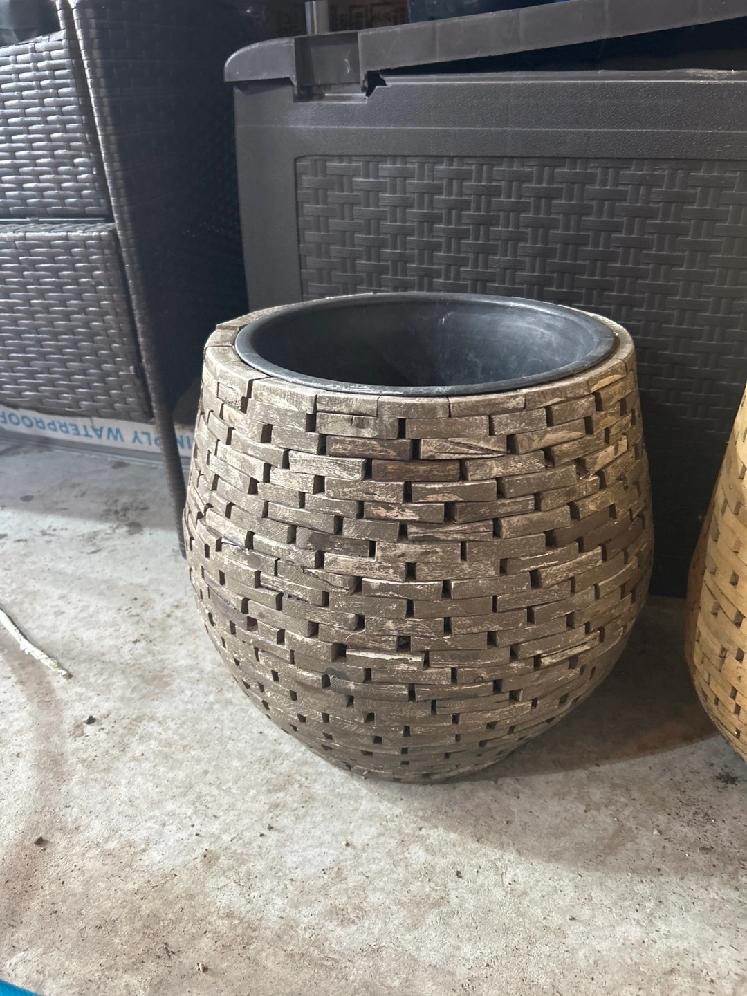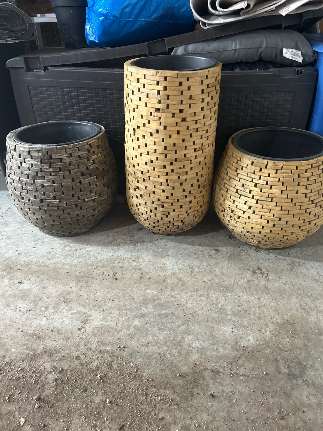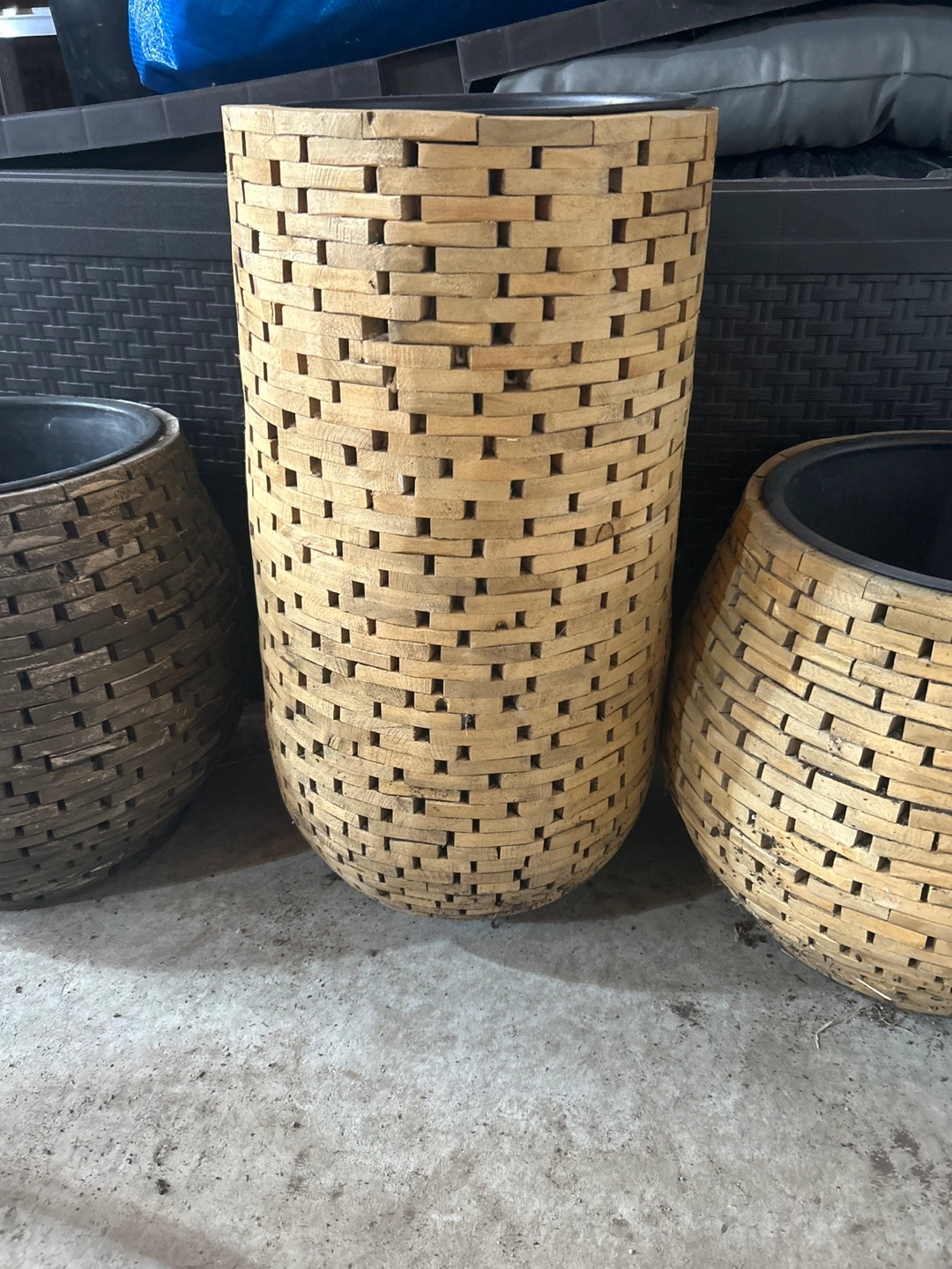 Three unique planters. Woven design. Varying heights and shapes. Perfect for indoor or outdoor use. Add a touch of rustic charm to your space. $15. Each or all 3 for $30