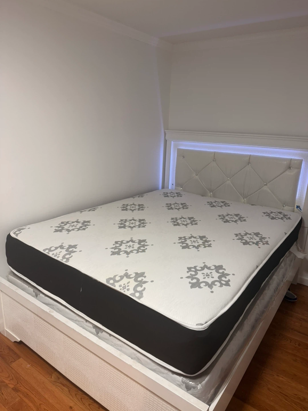 This is a queen-size mattress with a decorative gray and white pattern. It features a dark gray border and a quilted top. It's about 8-10 inches thick. It's suitable for a queen bed frame. It's like this as seen in the photo the whole game