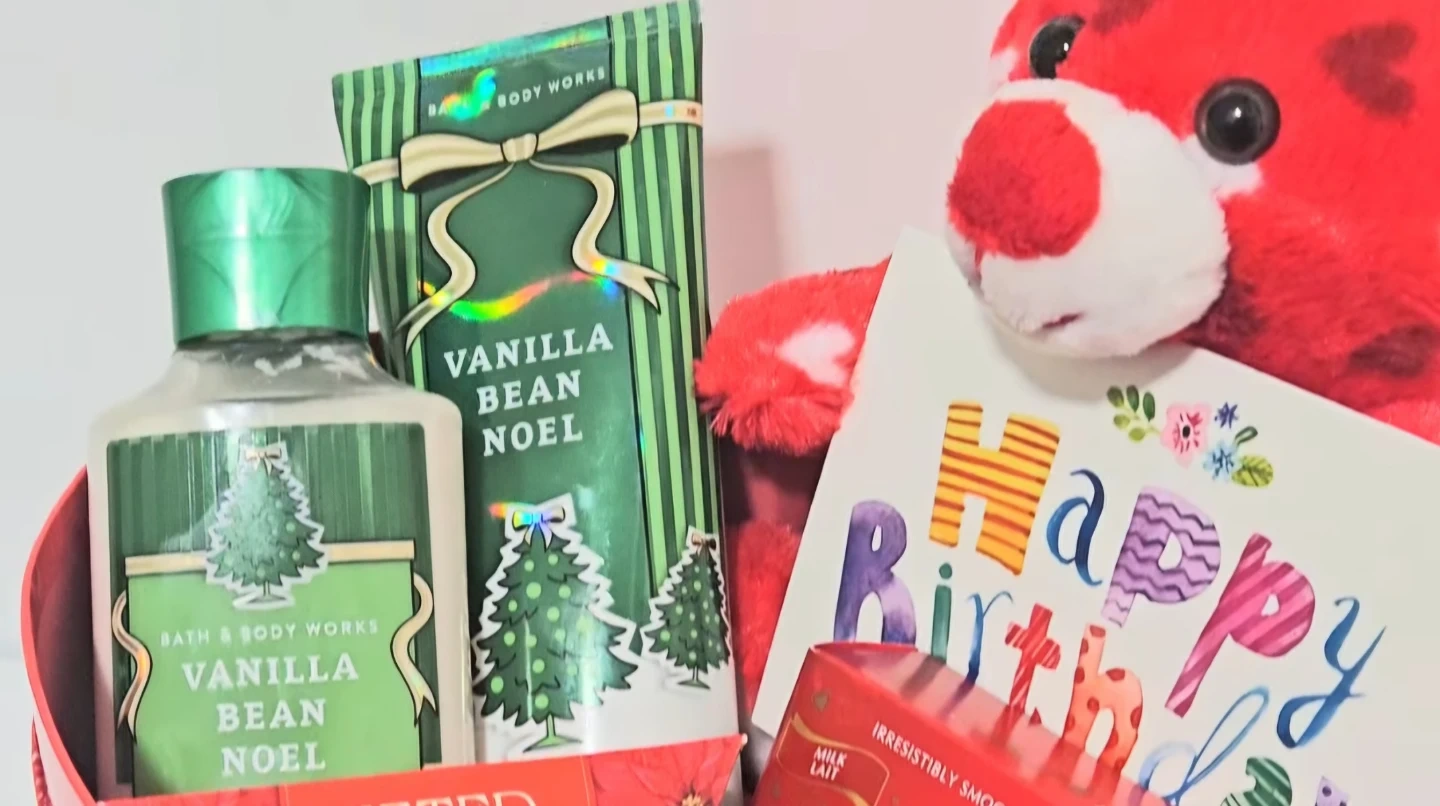 A birthday gift box featuring Bath & Body Works care items. It also includes chocolates, flavored tea sachets, scented candle and a happy birthday card with a plush bear. Perfect for a birthday surprise!