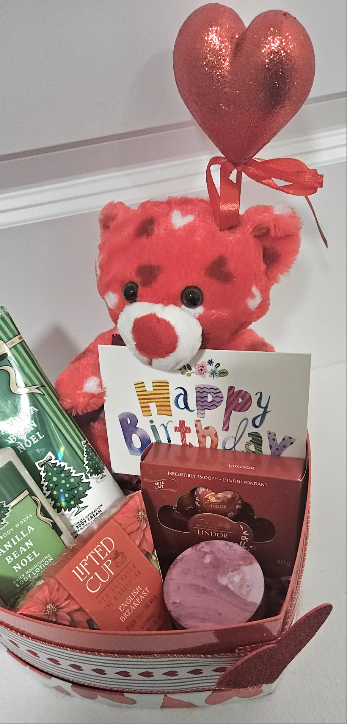 A birthday gift box featuring Bath & Body Works care items. It also includes chocolates, flavored tea sachets, scented candle and a happy birthday card with a plush bear. Perfect for a birthday surprise!