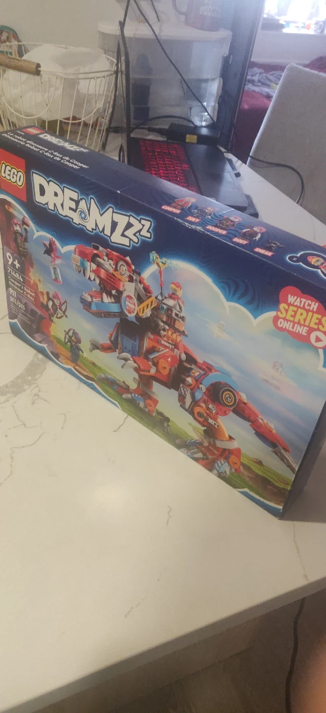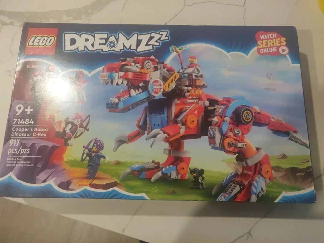This is the LEGO DREAMZzz Cooper's Robot Dinosaur C-Rex set, number 71484. It includes 917 pieces and is recommended for ages 9 and up. It comes with minifigures and accessories for building and play.