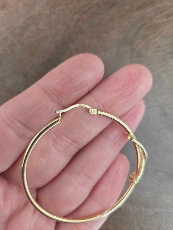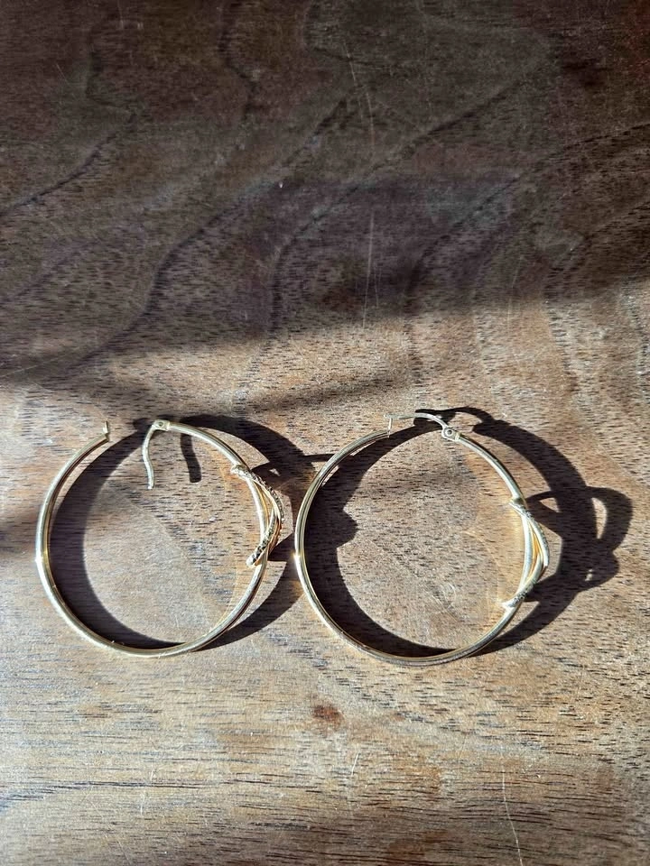 Absolutely gorgeous large hoop earrings with a solid clasp that stays shut. These are 14 karat filled gold which means they are very beautiful and will last a long time.