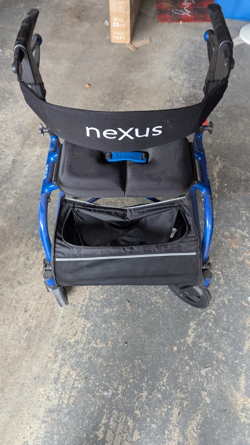 Nexus walker rollator in a vibrant blue. It features a comfortable seat and a handy storage basket underneath. Great for mobility assistance!