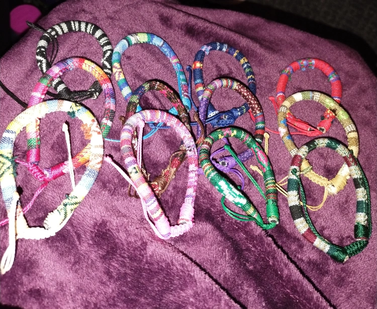 Assorted colourful bracelets. Woven fabric. Adjustable sizing. Perfect for layering or gifting. $4 each or 2 for $7.