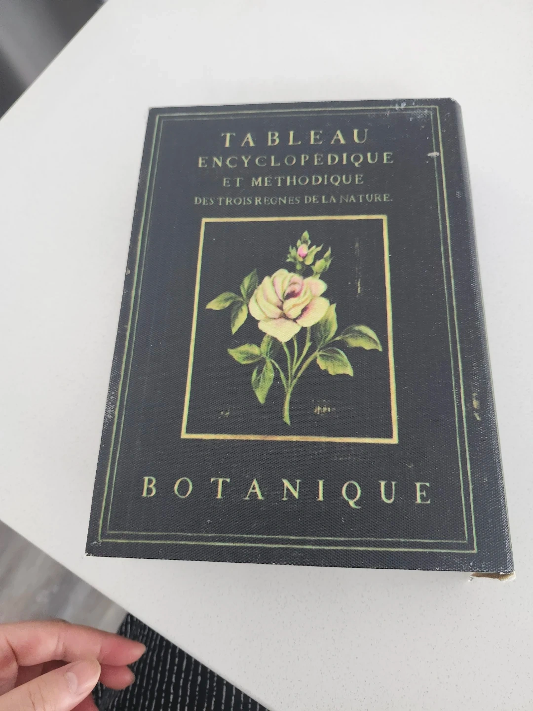 This decorative box is designed to look like a vintage book with a "Botanique" cover and floral illustration. It opens to reveal a lined interior for storing small items. It's a lovely piece for display on a shelf or desk.