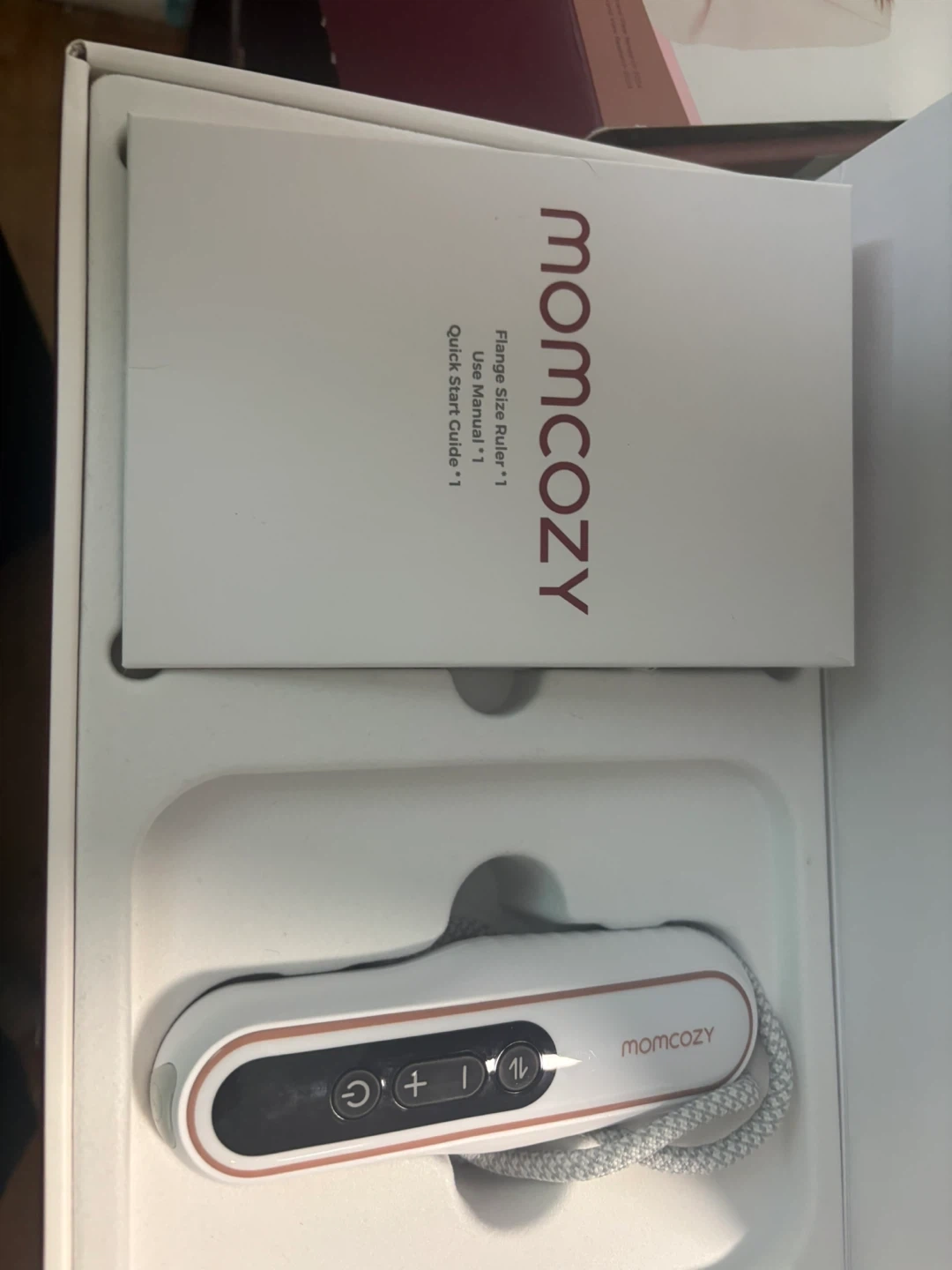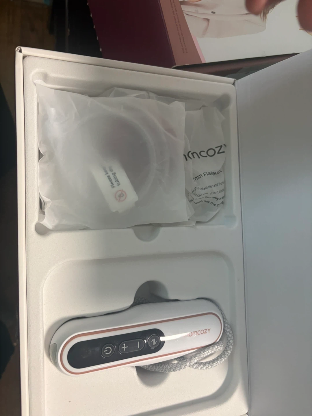 Momcozy V2 Pro breast pump. Ultra-light and potent design with quiet operation. Features a comfortable silicone flange and hands-free pumping capability. Includes original box and all accessories.
