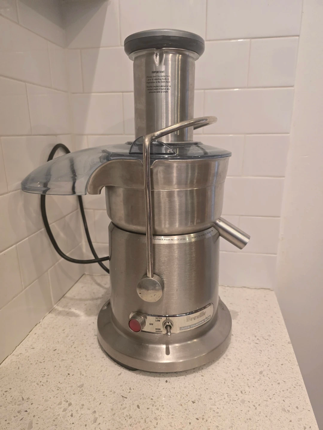 This is the Breville Juice Fountain Elite Juicer. It's constructed with durable brushed stainless steel. This juicer is great for quickly and efficiently extracting juice from fruits and vegetables.
