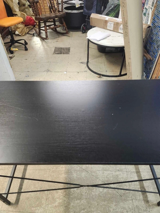 This black desk is sturdy and ready for a new home! It does show some signs of wear, with a few scratches on the surface, as shown in the pictures. Despite the imperfections, it's a great workspace for your home office or study area. Colour: Black. Material: Wood and metal. Condition: Used, with visible scratches. I've seen similar desks listed on Kijiji for around $40-$70, so I'm pricing this one at $50, considering its condition. Cash accepted.