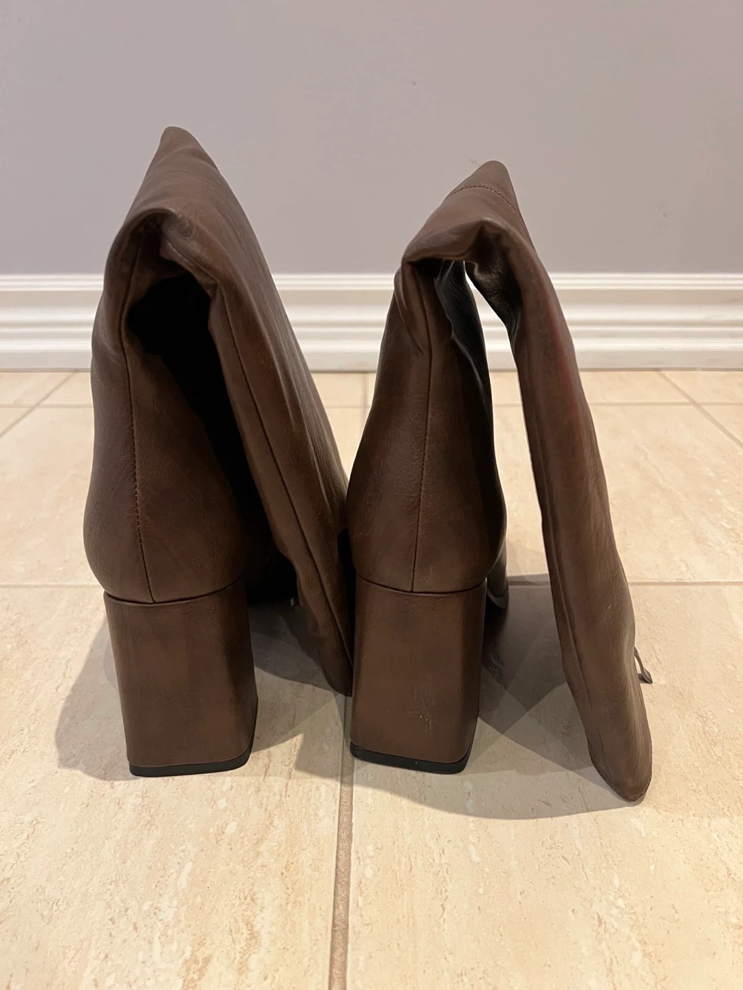 Brown Faux Leather Knee-High Boots with Block Heels