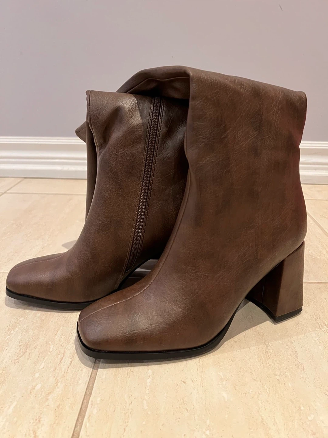 These stylish brown knee-high boots feature a faux leather finish and a comfortable block heel. They zip up the side for easy wear. The square toe adds a modern touch.