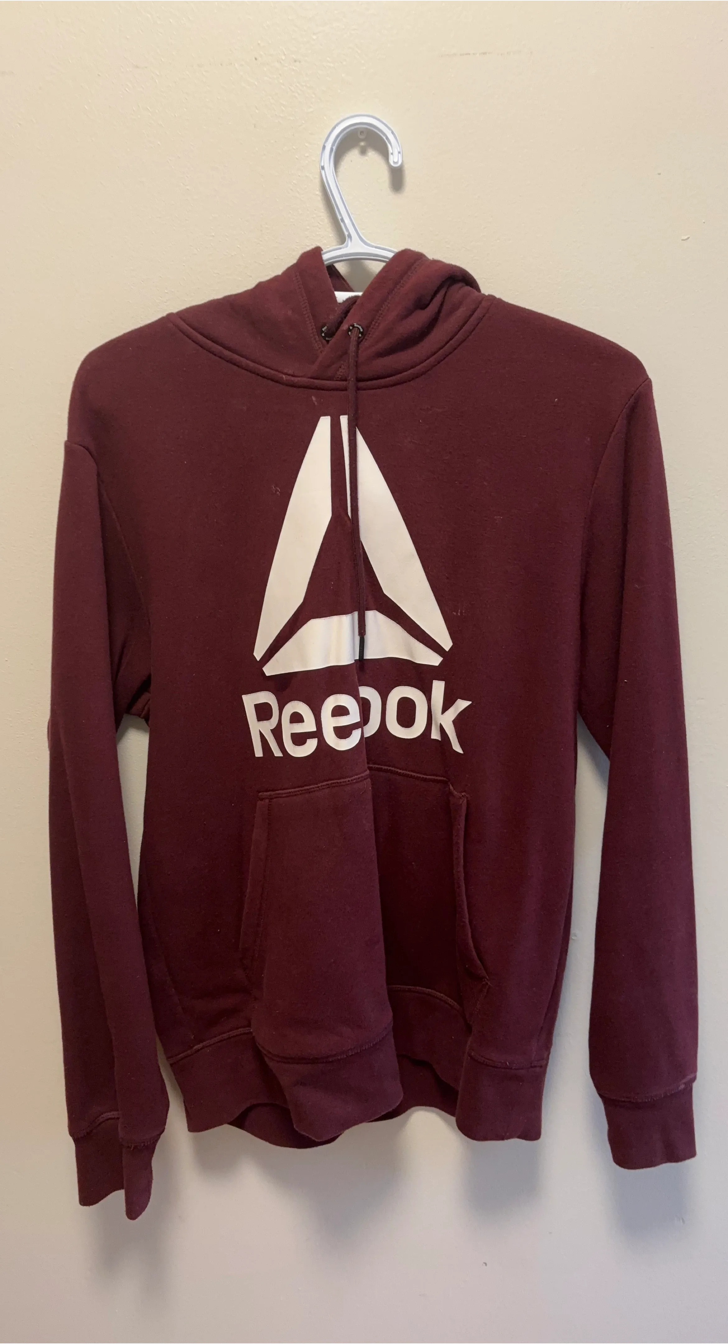 This is a Reebok burgundy hooded sweatshirt. It's made with 60% cotton and 40% polyester for the hood lining. The outer shell is 60% cotton and 40% polyester. It features a front kangaroo pocket.