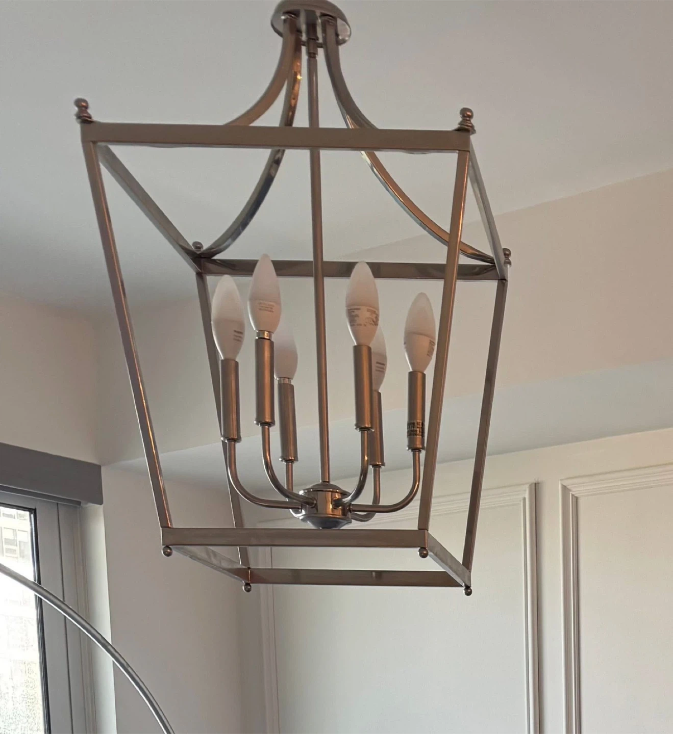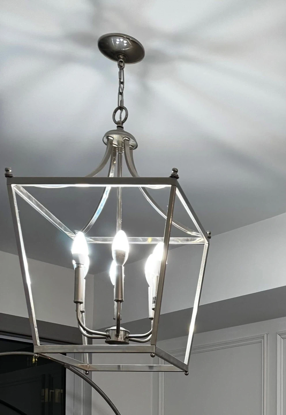 I wish I took a better picture before I swapped it but this stylish lantern-style chandelier brings a modern touch to any room. It features a brushed nickel finish and clear glass panels.