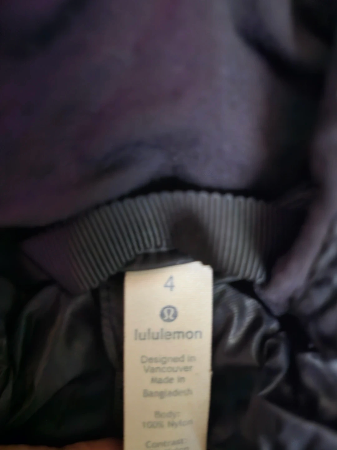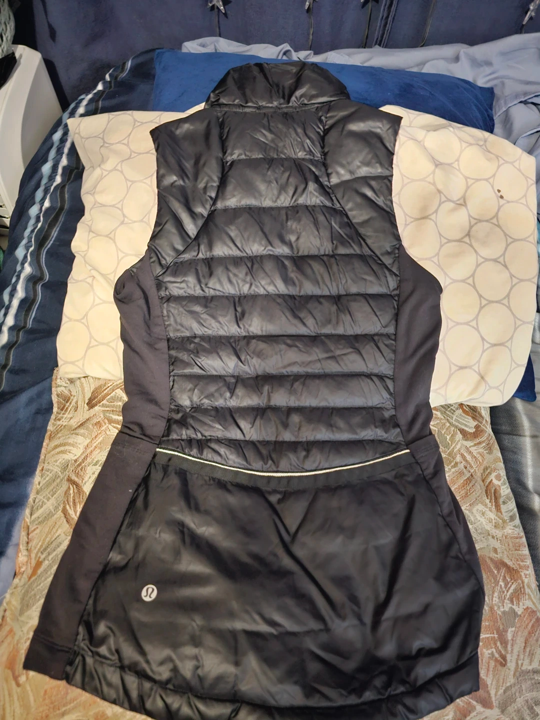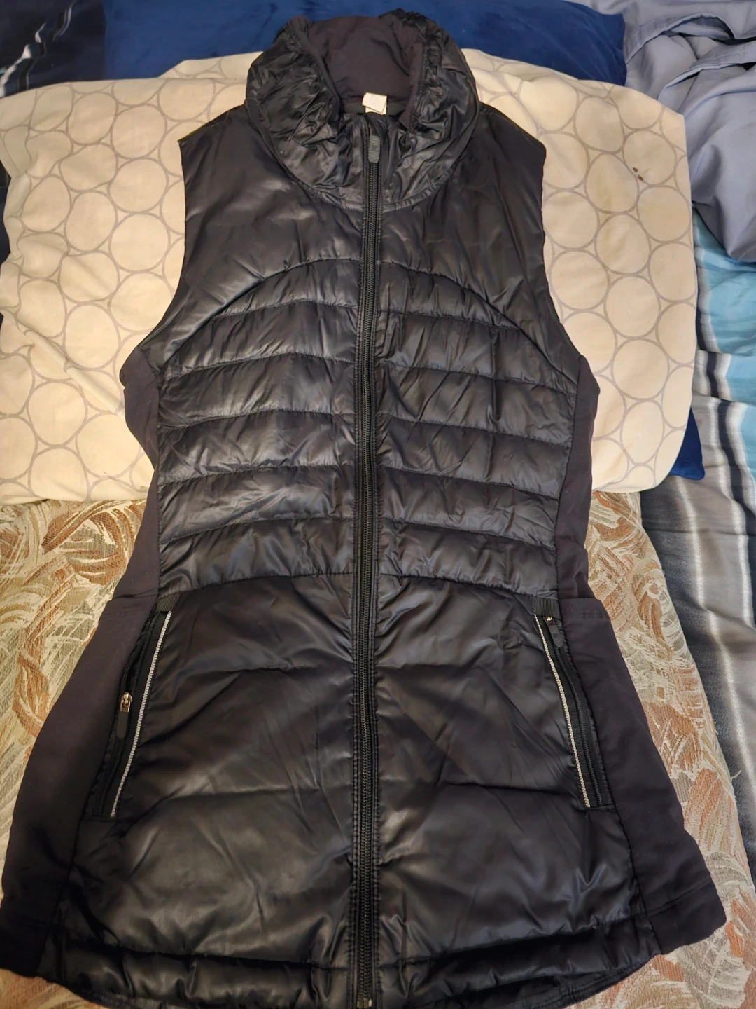 This is a black Lululemon puffer vest. It's a size 4. The vest is designed in Vancouver and made in Bangladesh.