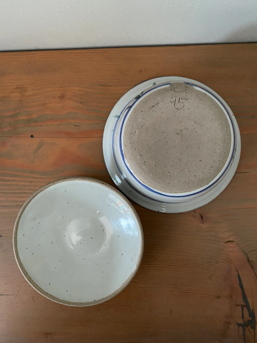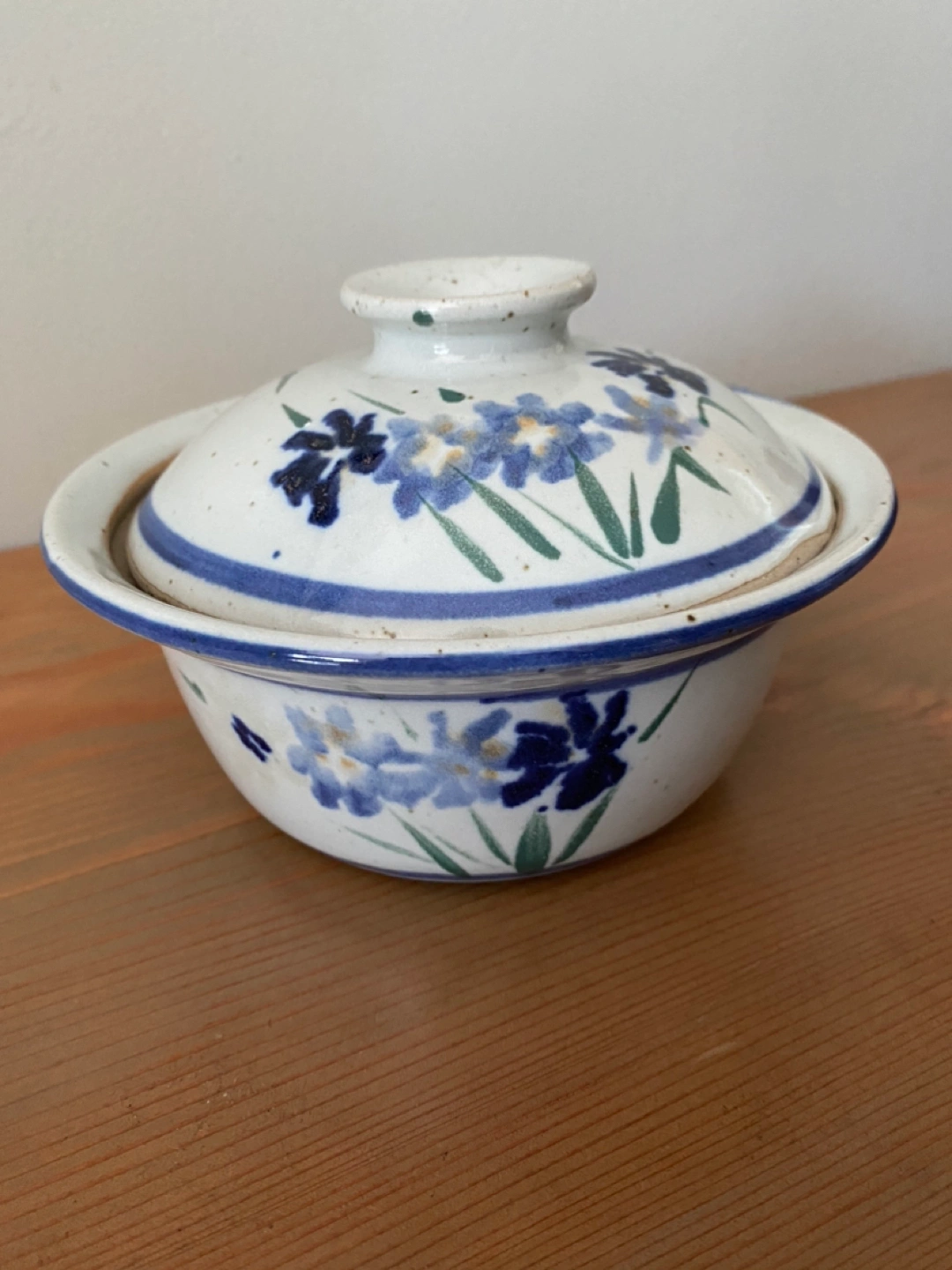 Small bowl with lid. Speckled pale grey glaze with blue flowers. Stamped and dated by the maker — someone with skills.