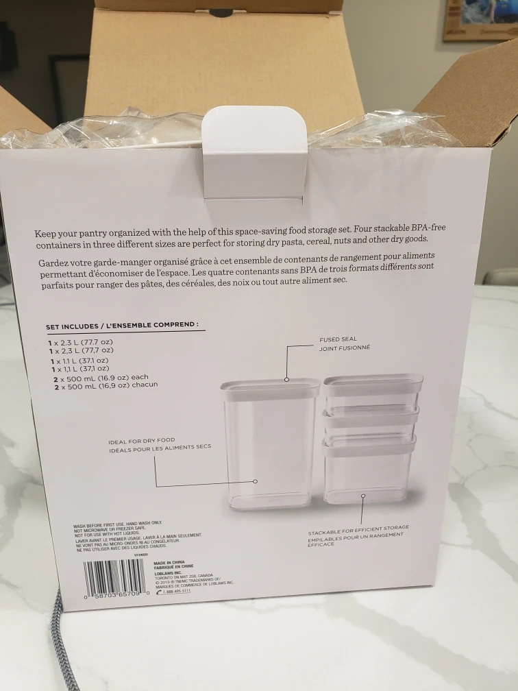 Eight-piece modular pantry storage container set. BPA-free. Stackable. Fused seal lid prevents food from getting trapped. Ideal for storing pasta, cereal, nuts and other dry goods. Various sizes included.