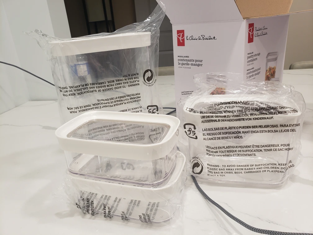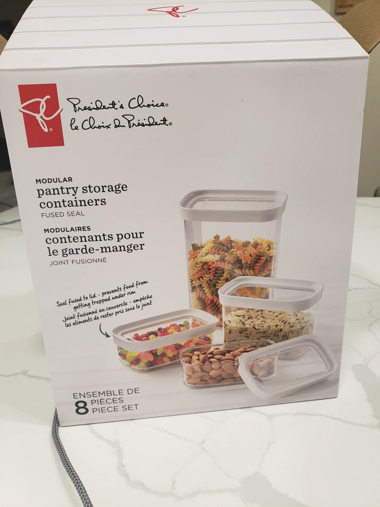 Eight-piece modular pantry storage container set. BPA-free. Stackable. Fused seal lid prevents food from getting trapped. Ideal for storing pasta, cereal, nuts and other dry goods. Various sizes included.