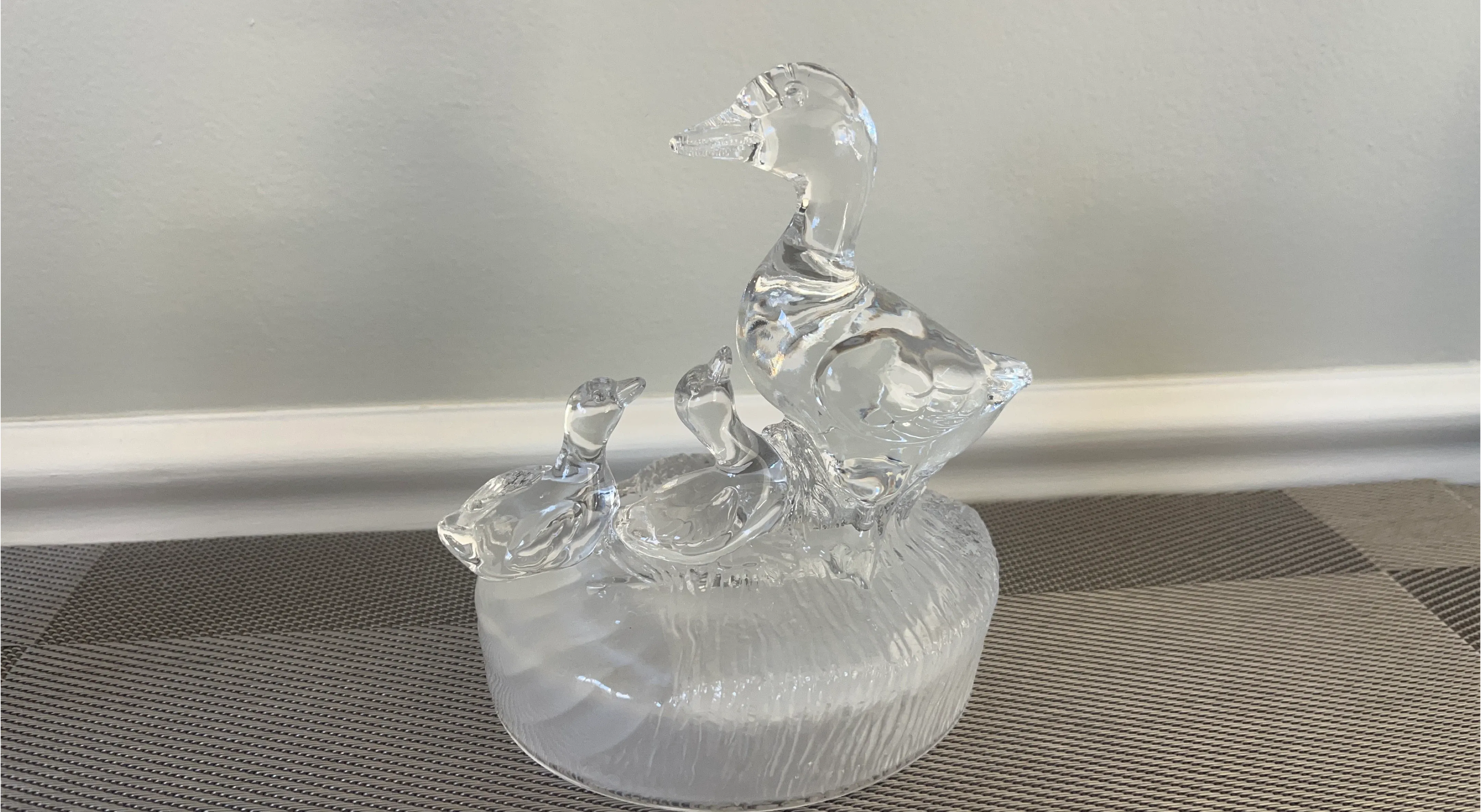A lovely crystal figurine featuring a mother duck with her ducklings. It's in great condition and would look lovely on a shelf or table. A charming piece for any collector!