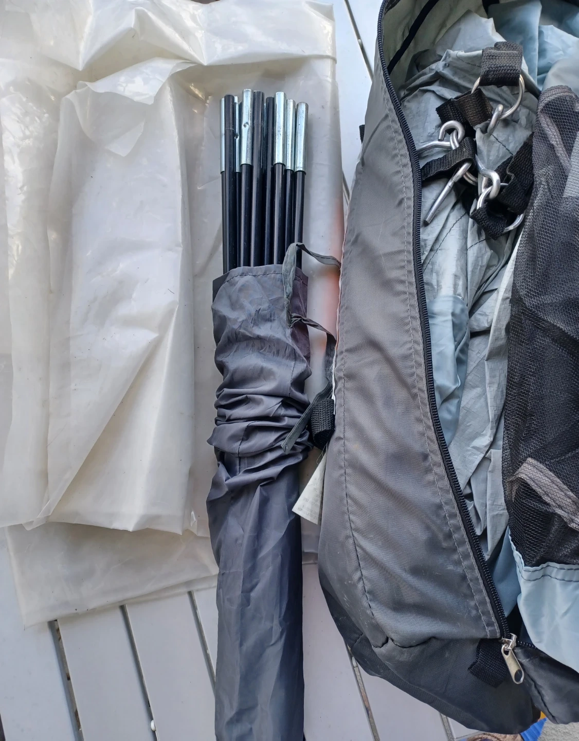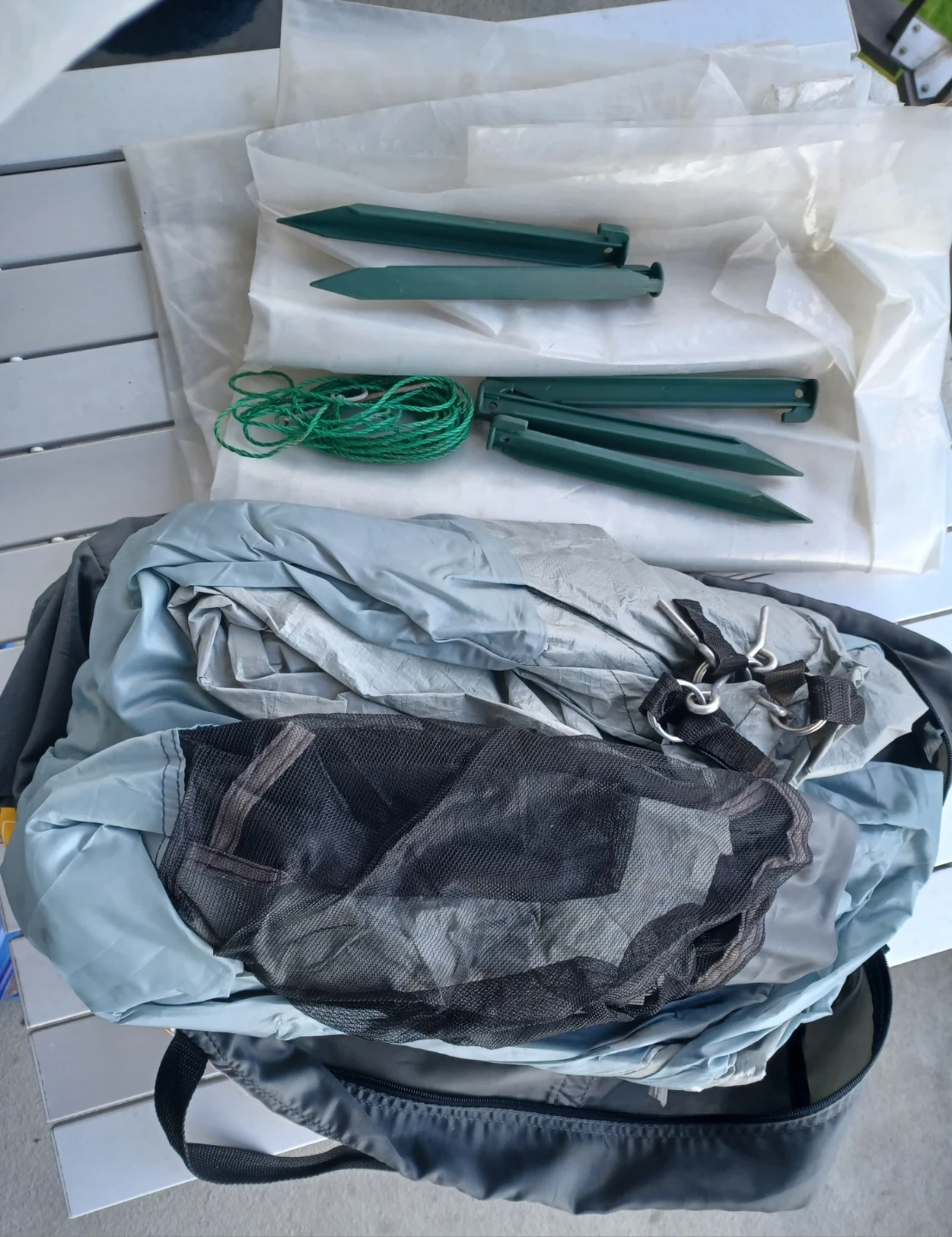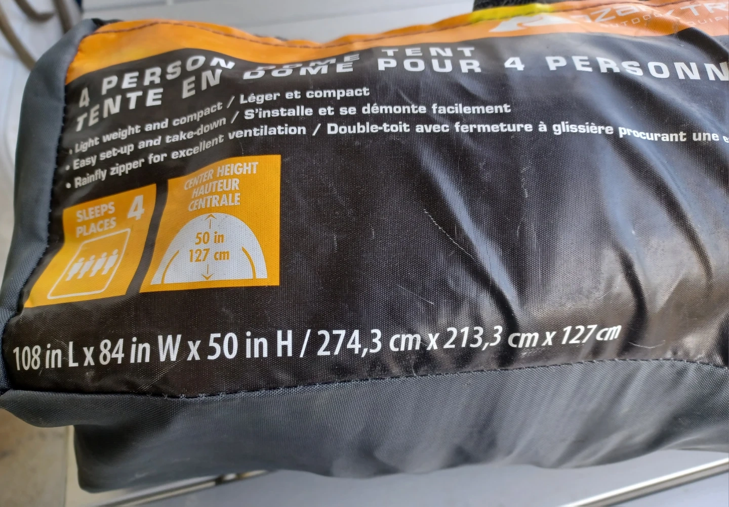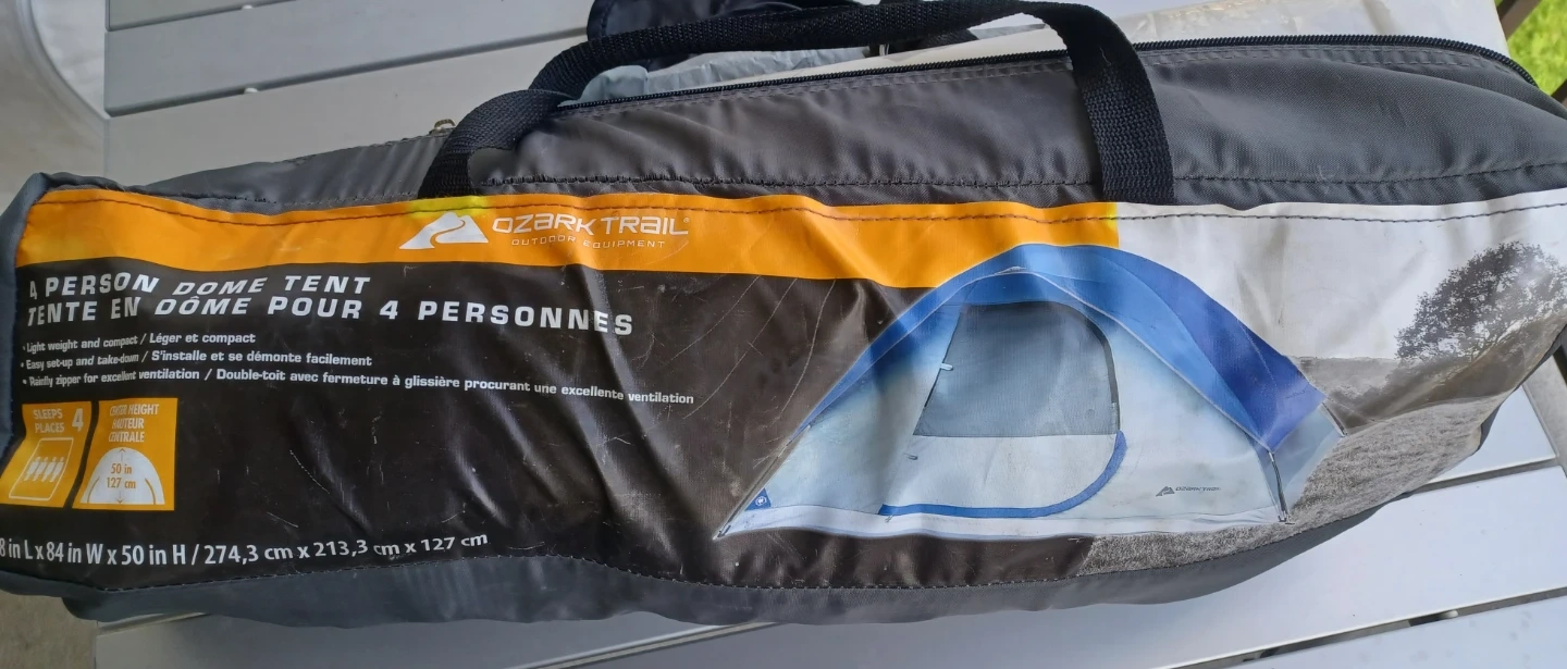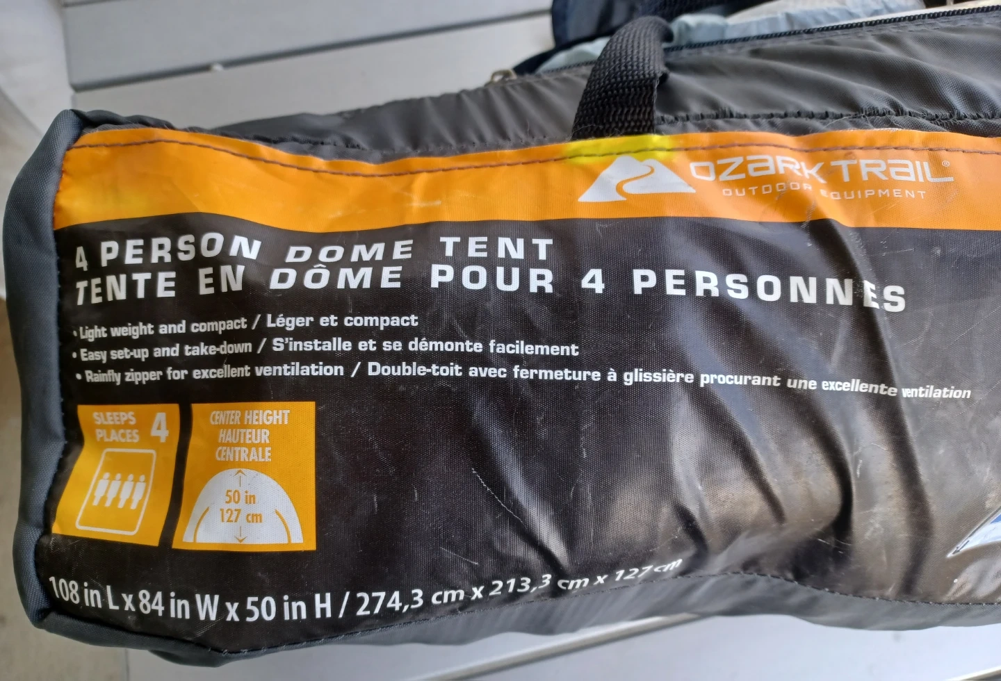 This is an Ozark Trail 4 person dome tent. It's light weight and compact. The tent's dimensions are 108 in L x 84 in W x 50 in H. This would be useful for camping trips. It's used in good condition. Pick-up Walkerville/East Windsor. Please check out my other listing.