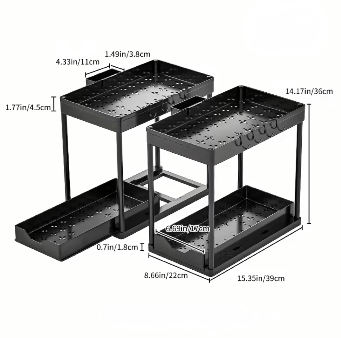 Easy to assemble 2 tier storage organizer, under cabinet basket organizer. Comes with 4 hooks and a hanging cup. Multi-Purpose, great for under sink storage, bathroom, kitchen or any place that you want more organization. Measurements shown in the pictures. Brand new, never used still in the box. Willing to negotiate or barter for a kitchen trash bin.