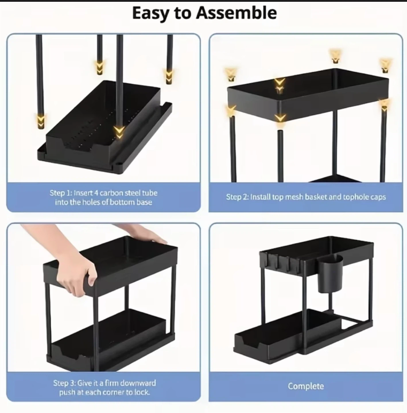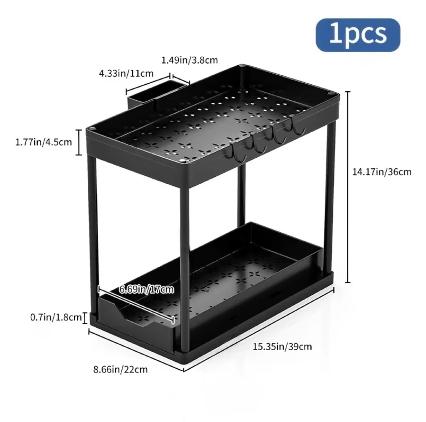 Easy to assemble 2 tier storage organizer, under cabinet basket organizer. Comes with 4 hooks and a hanging cup. Multi-Purpose, great for under sink storage, bathroom, kitchen or any place that you want more organization. Measurements shown in the pictures. Brand new, never used still in the box. Willing to negotiate or barter for a kitchen trash bin.