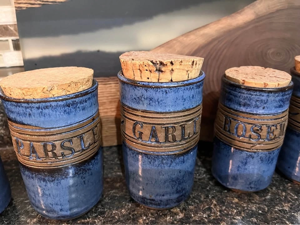 These are unique, handcrafted studio pottery pieces, each artist-signed. They are in perfect condition and would be a showstopper for a country or boho chic kitchen. Each piece is 4-4.5 inches tall. Makes a great shower or birthday gift!