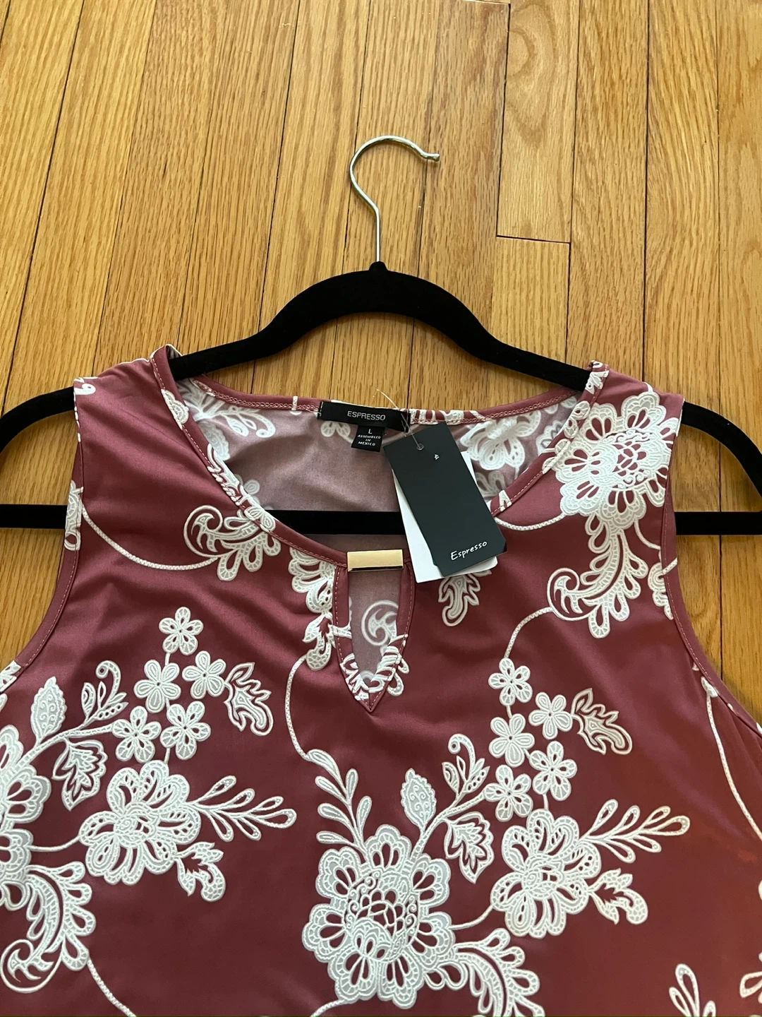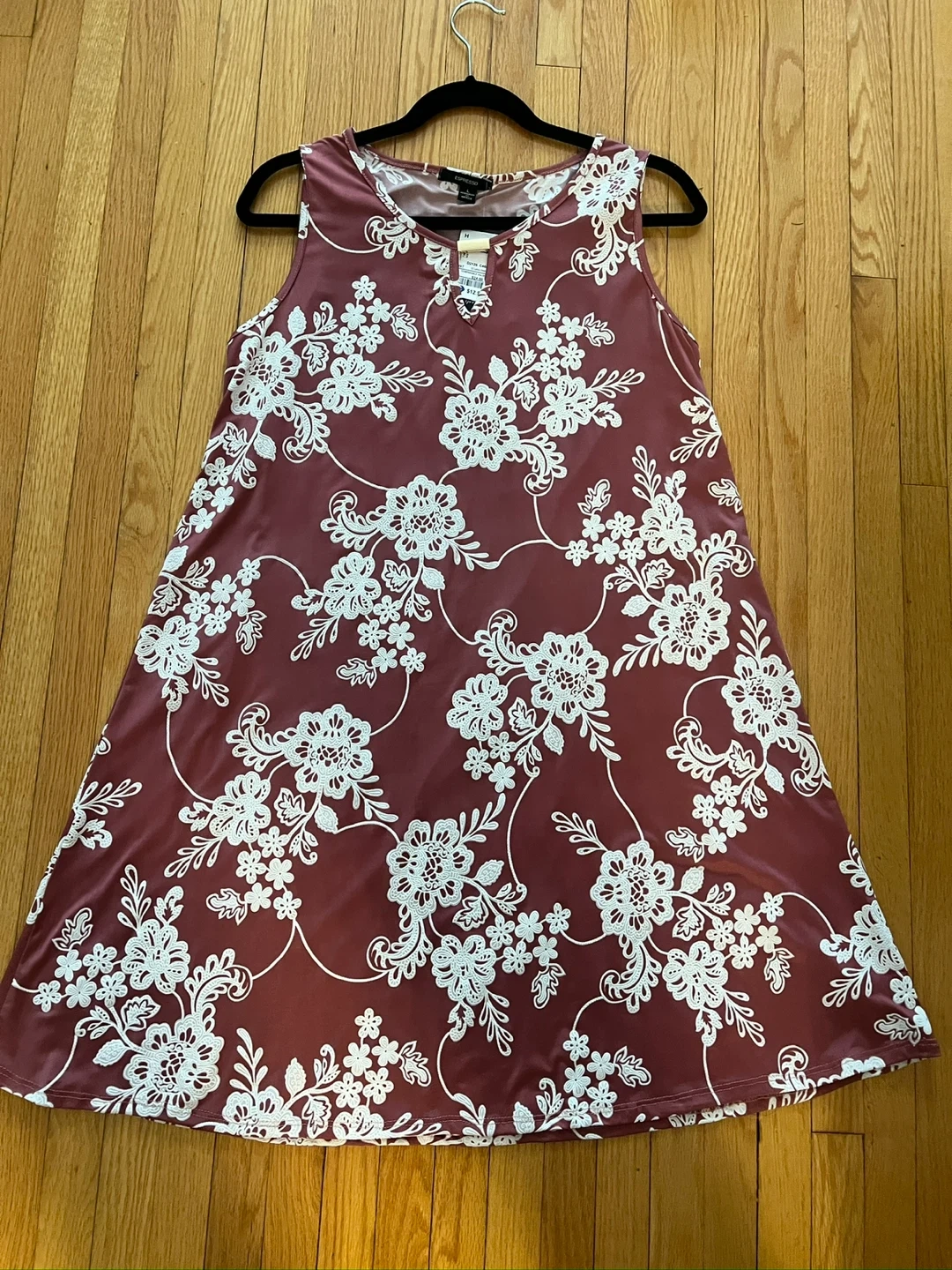 This is a brand new Espresso sleeveless dress with a lovely white floral print on a deep salmon background. It's a size Large and features a keyhole neckline. A great casual option for warmer weather! The dress is very full free-flowing and flattering. Item comes from a pet and smoke free home. Port union/401/Pickering for pick up.