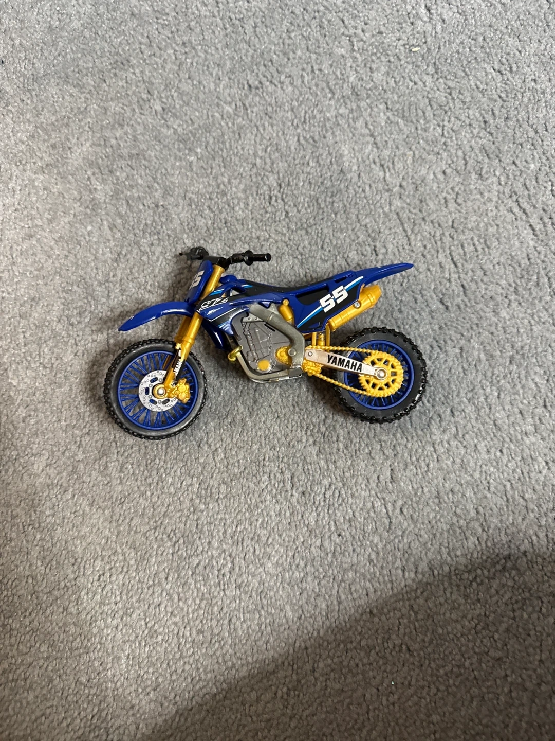 This is a Yamaha toy dirt bike, blue and gold with number 55. It's a detailed replica with realistic wheels and suspension. It's a cool addition for any young motorsports fan!