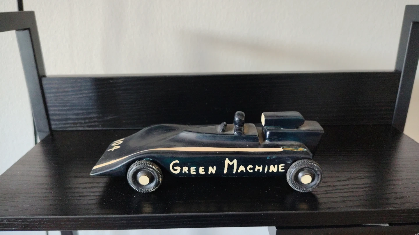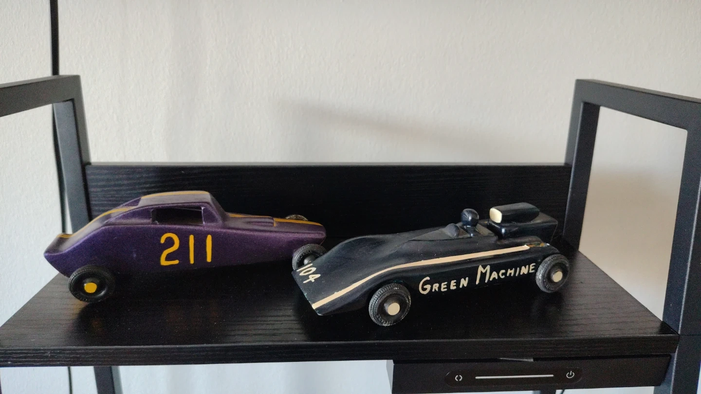 Two decorative wooden toy race cars, one purple with yellow numbering '211' and the other black with 'GREEN MACHINE' written on the side. These look like they could be pinewood derby cars.