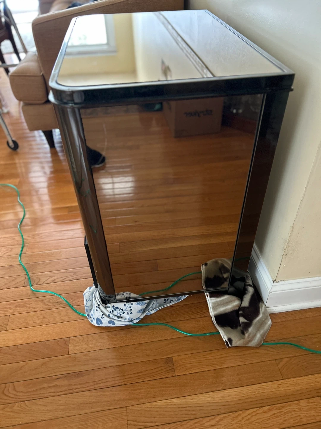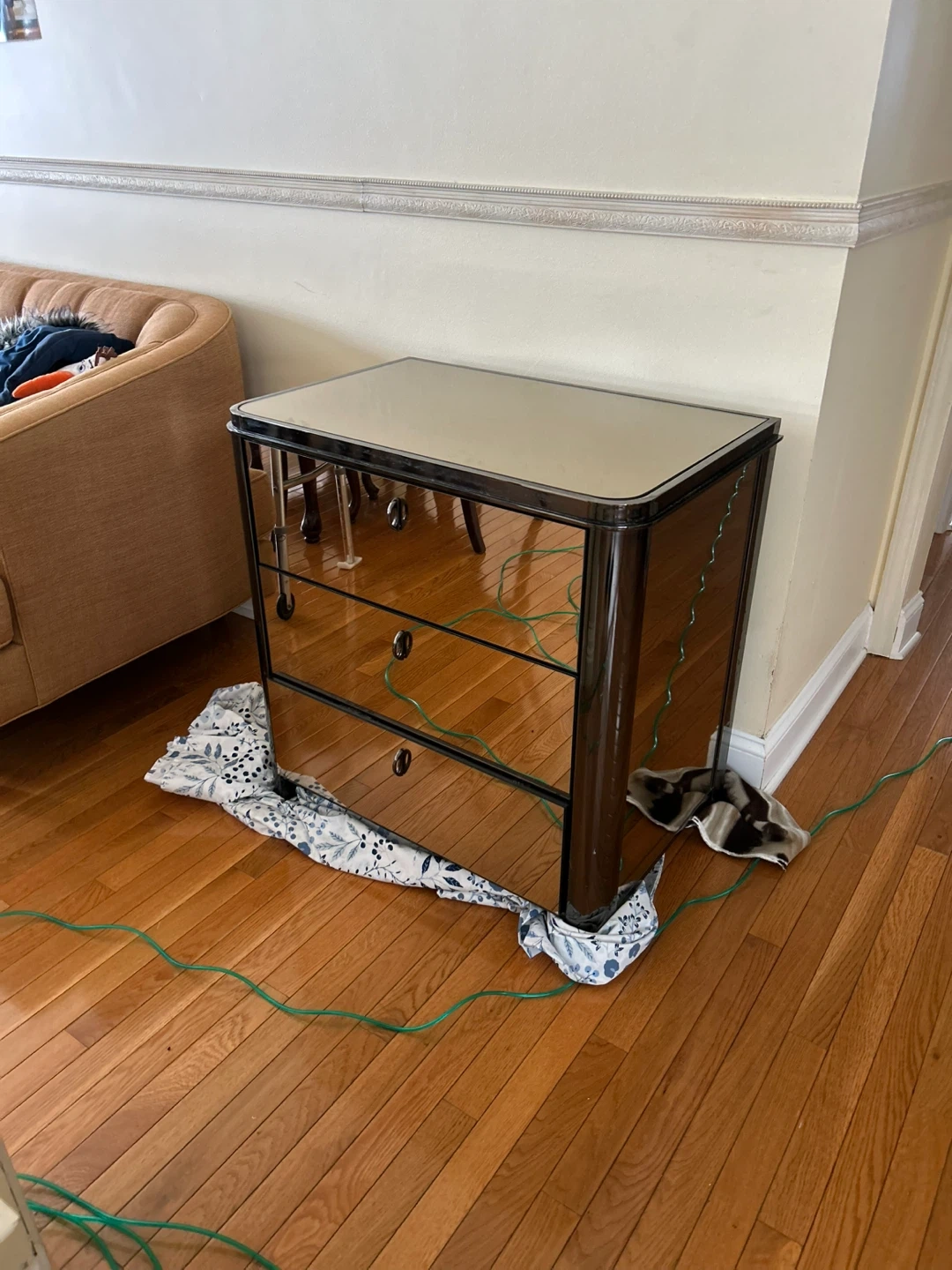 Selling a mirrored dresser with three drawers. It's a stylish piece that can add a touch of elegance to any room. The mirrored finish reflects light and creates a sense of spaciousness. Perfect for storing clothes or other items!