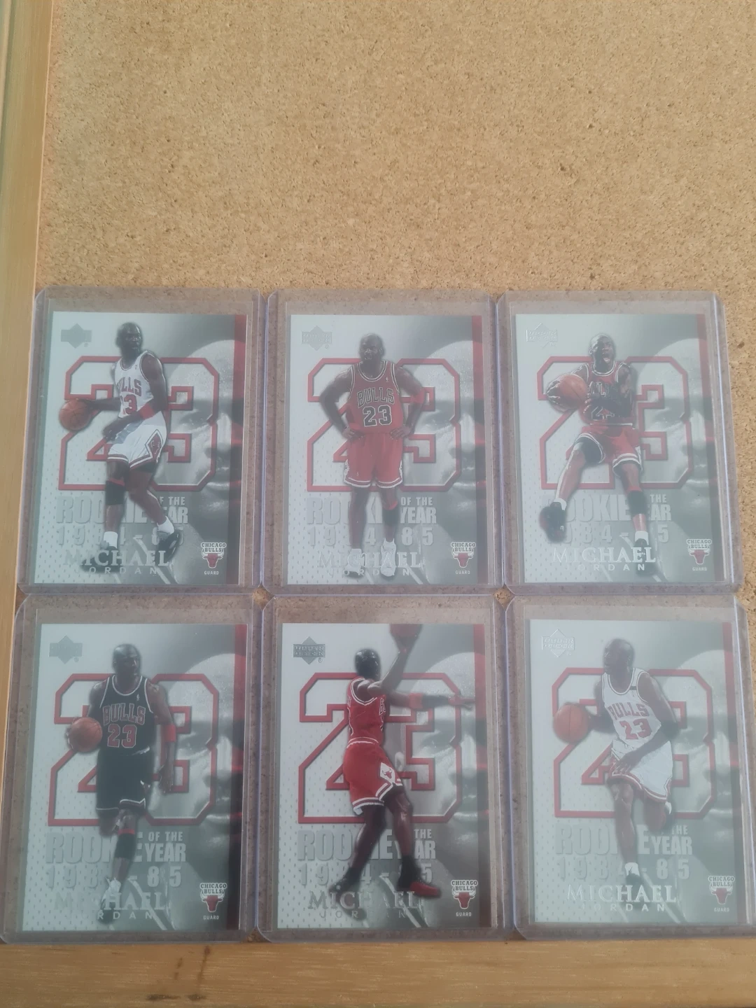 This is a set of 6 Michael Jordan Rookie Year trading cards from the 1984-85 season. Each card features a different pose of Jordan in his Chicago Bulls uniform. They're all in protective sleeves and ready for your collection!