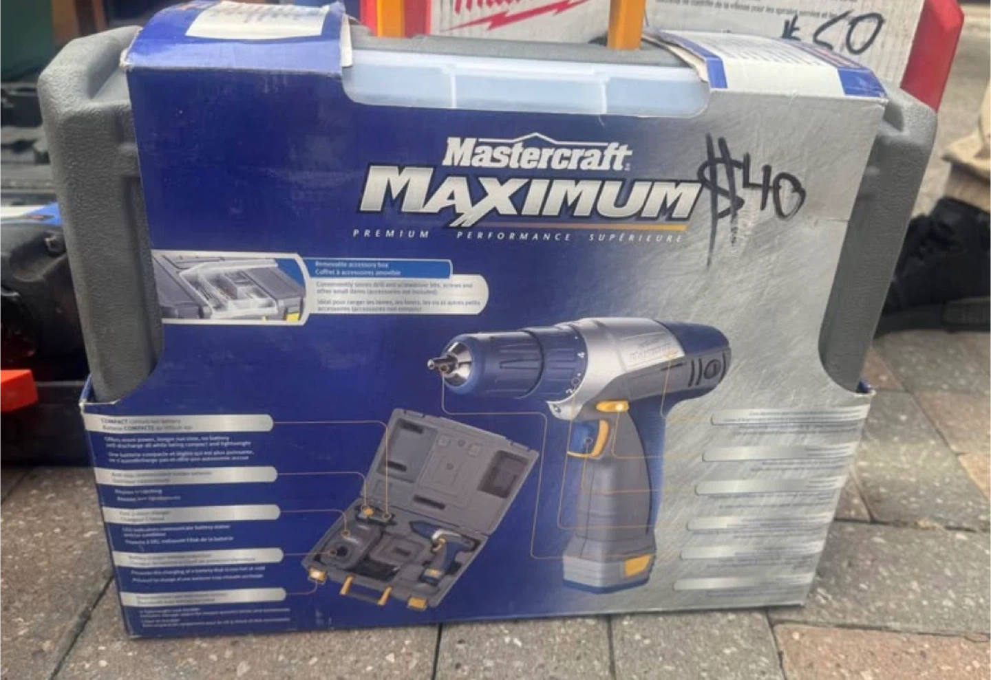 This is a Mastercraft MAXIMUM cordless drill, presented with its premium performance. It comes with a removable accessory box for storing bits and other small items. This tool is great for various home improvement tasks!