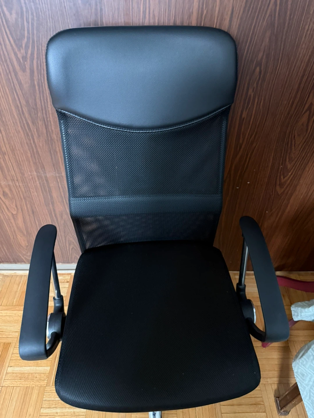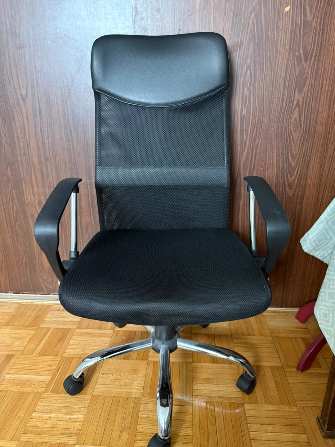 This is a black office chair with a mesh back for breathability and padded armrests. It features a comfortable seat cushion and a chrome base with wheels for easy mobility. It's suitable for home offices or workspaces.