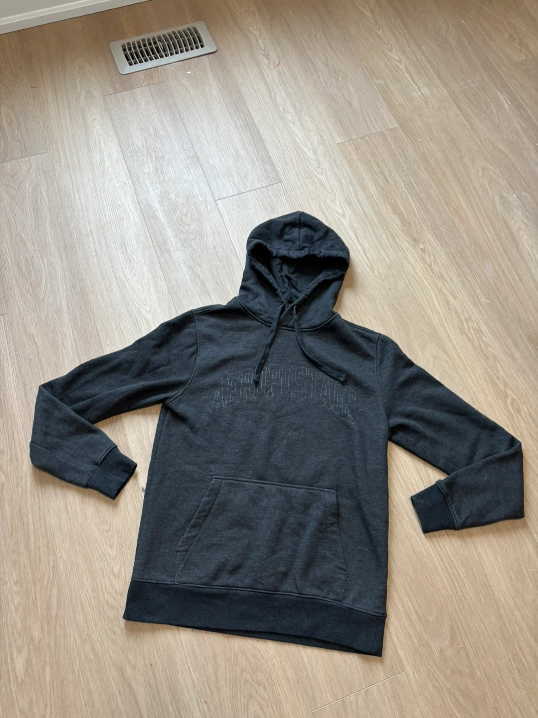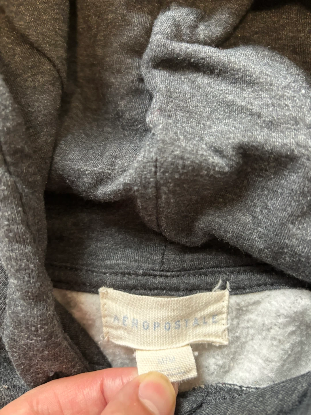 Grey Aeropostale hoodie with a front kangaroo pocket and adjustable drawstring hood. Made with a comfortable cotton blend.