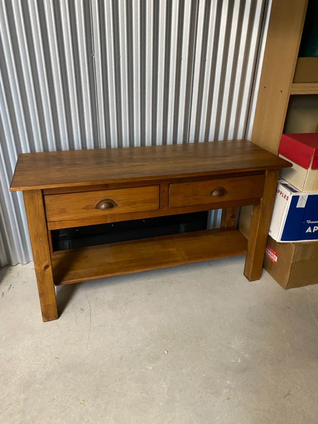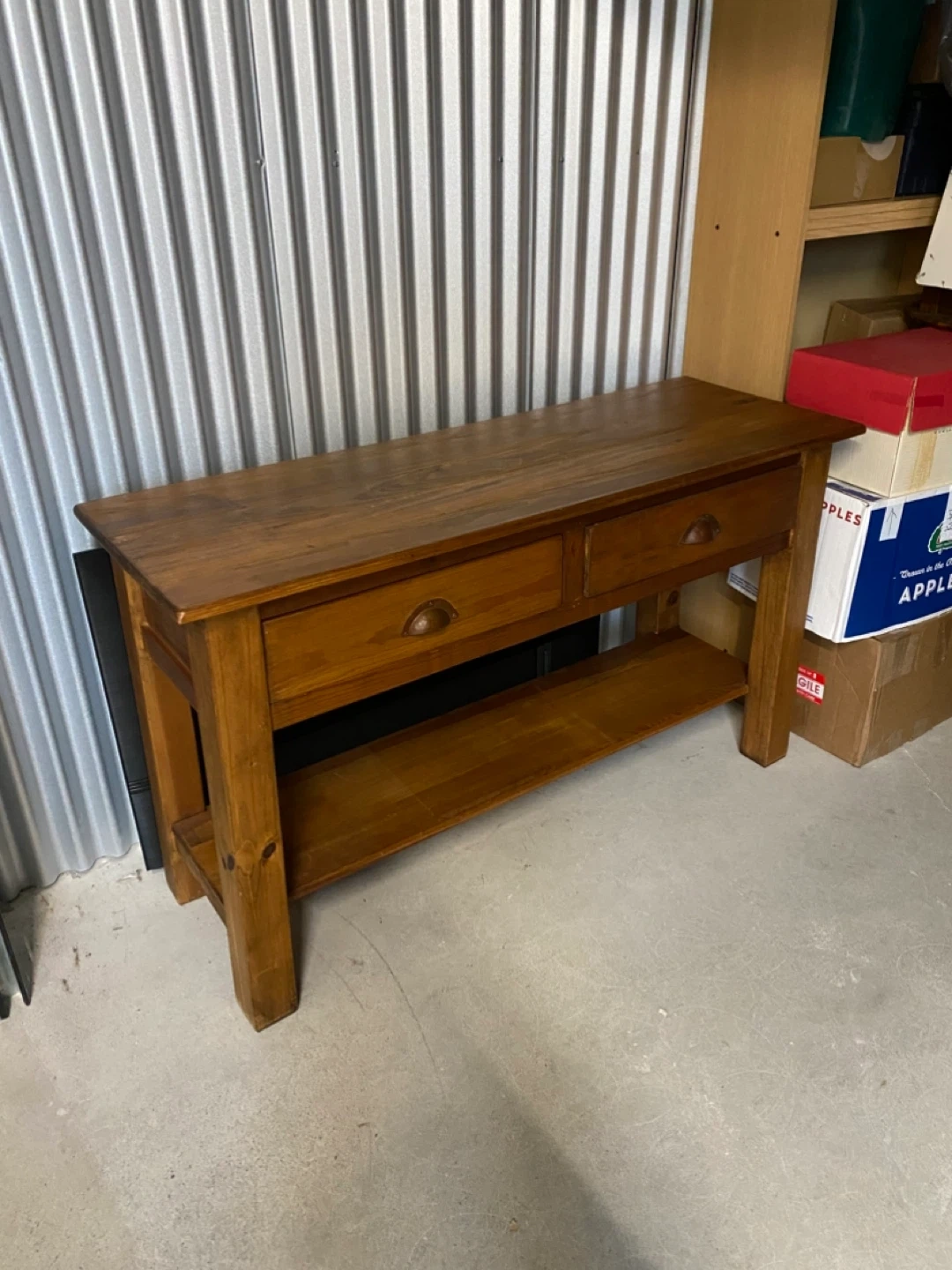 A lovely wooden console table featuring two drawers and a bottom shelf. It's made of solid wood with a warm, natural finish. This piece offers some convenient storage and display space.