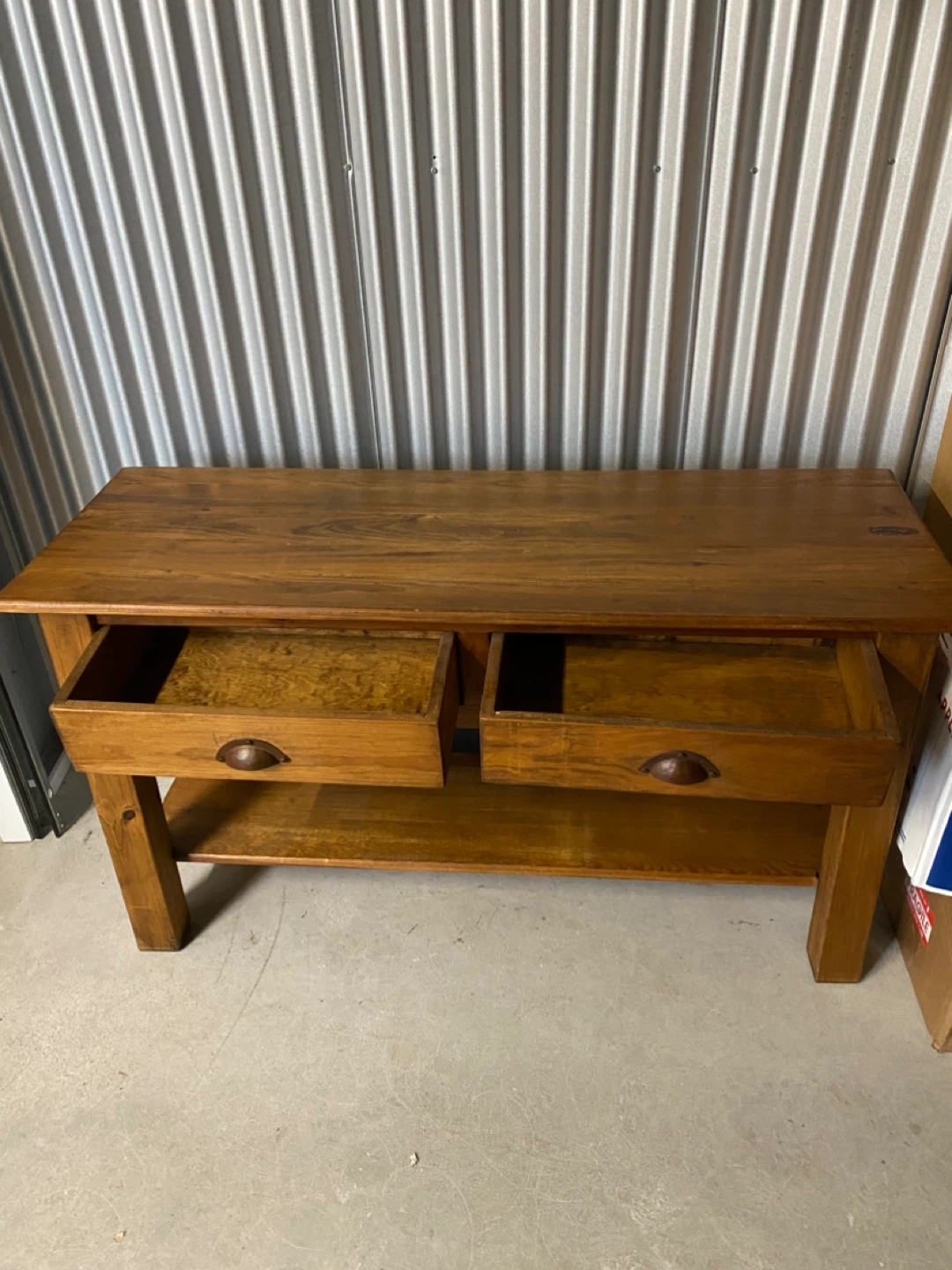 A lovely wooden console table featuring two drawers and a bottom shelf. It's made of solid wood with a warm, natural finish. This piece offers some convenient storage and display space.
